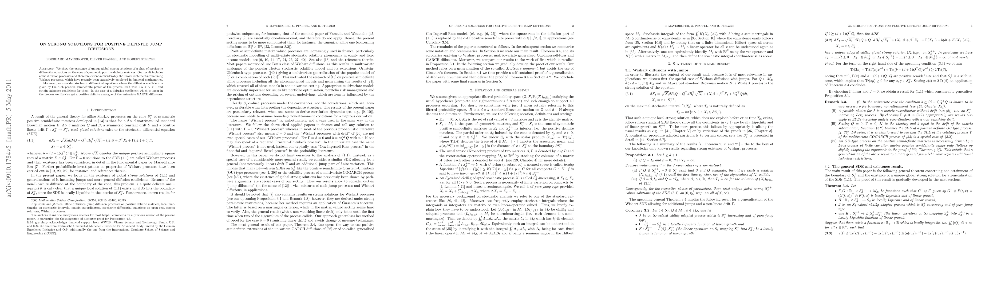 This paper proves the existence of unique global strong solutions for stochastic differential equations on the cone of symmetric positive definite matrices, extending results for Wishart processes used in finance. It also provides existence conditions for diffusion coefficients involving the alpha-th positive semidefinite power of the process, and derives positive definite analogues of univariate GARCH diffusions for linear coefficients.