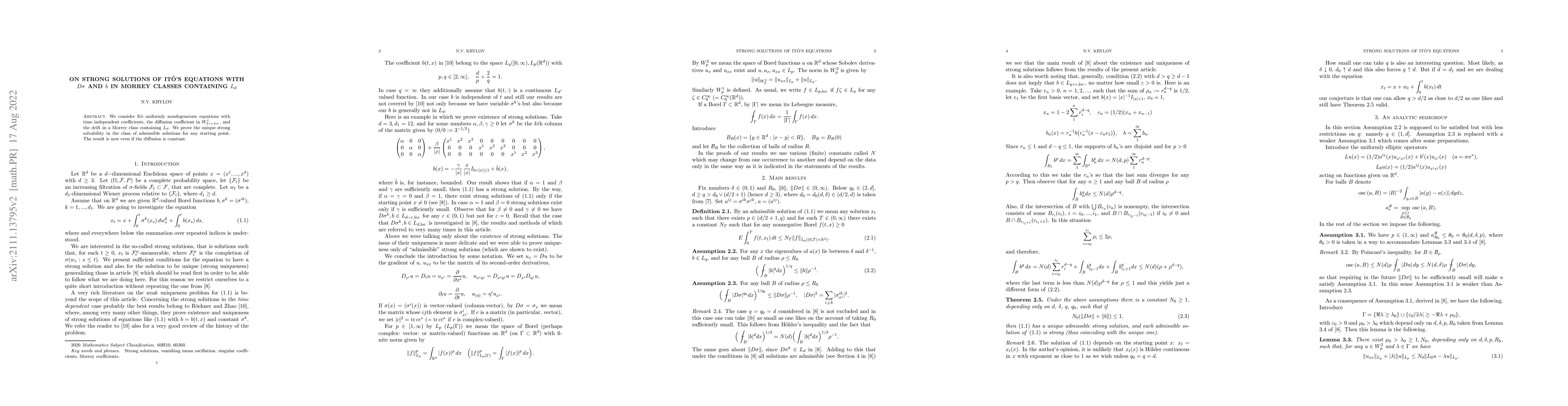 Summary: This paper proves the unique strong solvability of Itô's uniformly nondegenerate equations with diffusion coefficients in $W^{1}_{2+\varepsilon,loc}$ and drift terms in a Morrey class containing $L_{d}$, establishing the result for any starting point, even when the diffusion is constant.