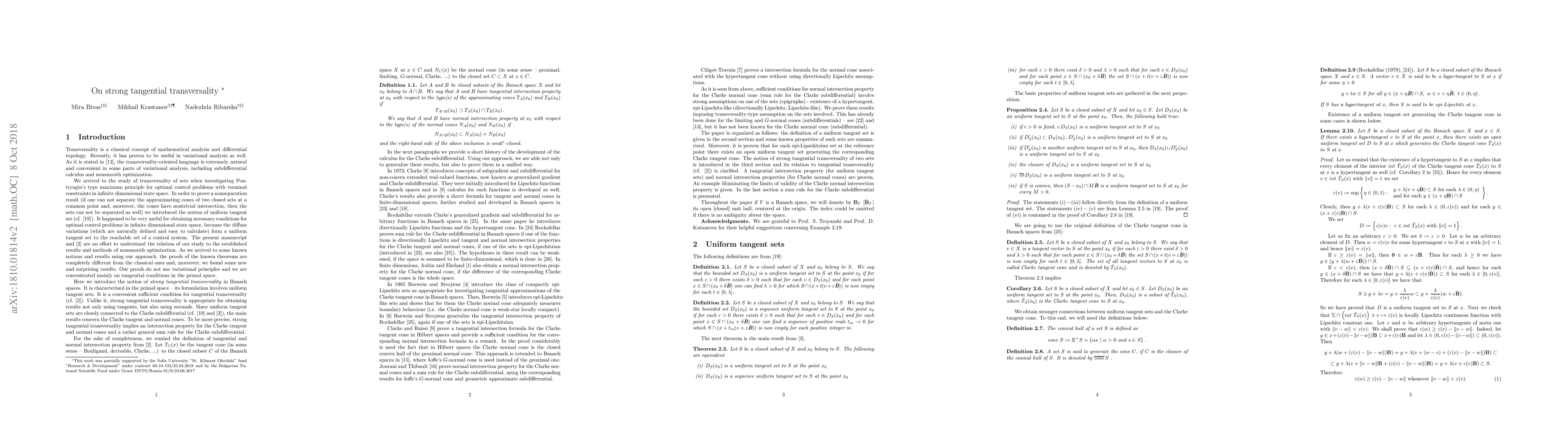 This paper introduces the concept of strong tangential transversality for closed subsets in a Banach space, establishing it as a sufficient condition for tangential transversality. It also presents properties of uniform tangent sets and proves a new sum rule for the Clarke subdifferential.