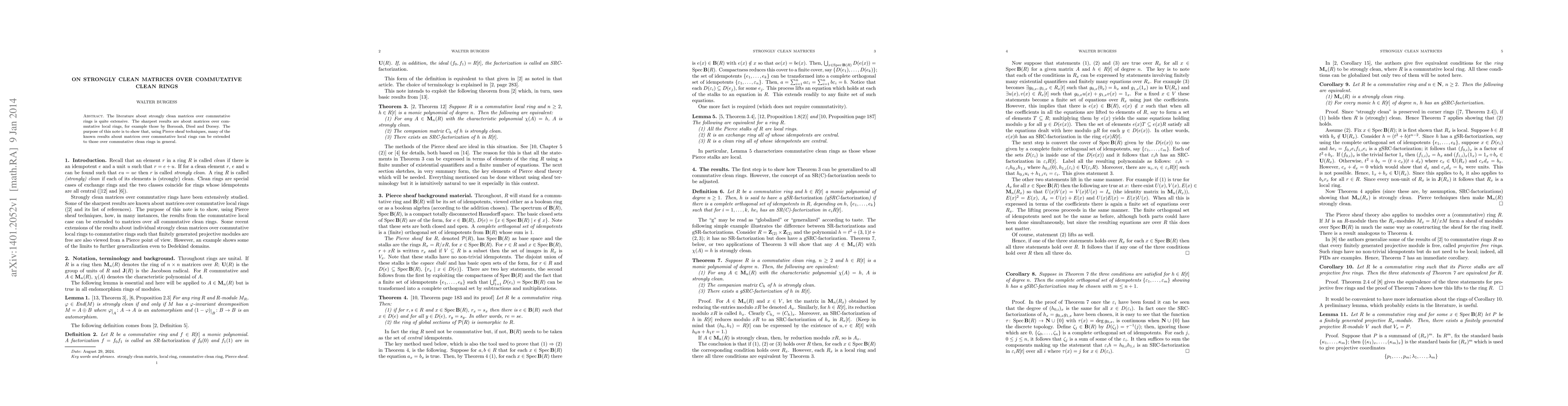 This paper extends known results about strongly clean matrices over commutative local rings to commutative clean rings using Pierce sheaf techniques. The focus is on leveraging advanced algebraic methods to generalize existing findings.