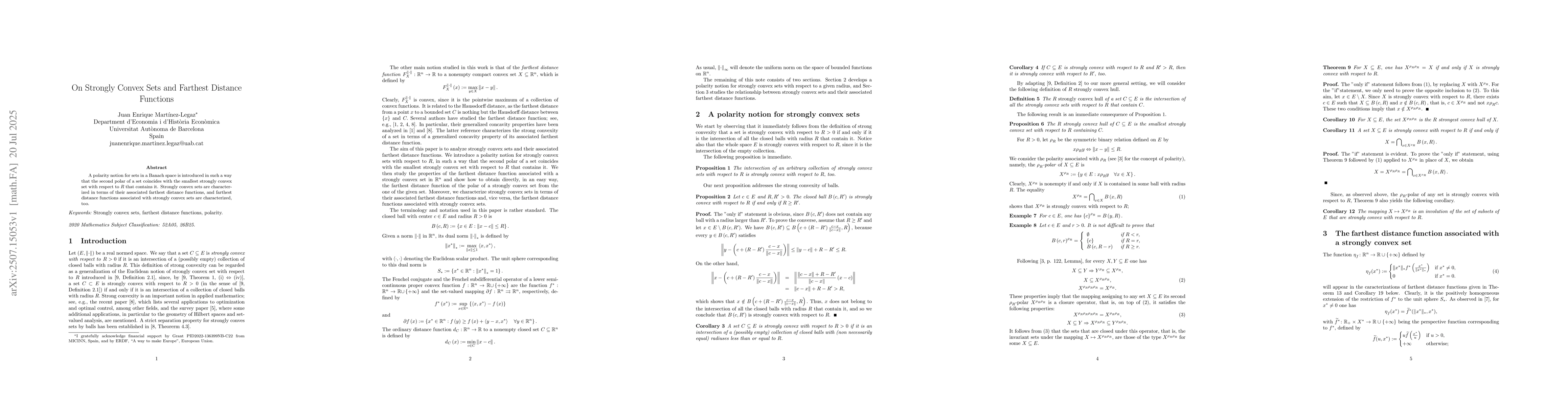 A polarity notion for sets in a Banach space is introduced in such a way that the second polar of a set coincides with the smallest strongly convex set with respect to R that contains it. Strongly convex sets are characterized in terms of their associated farthest distance functions, and farthest distance functions associated with strongly convex sets are characterized, too.