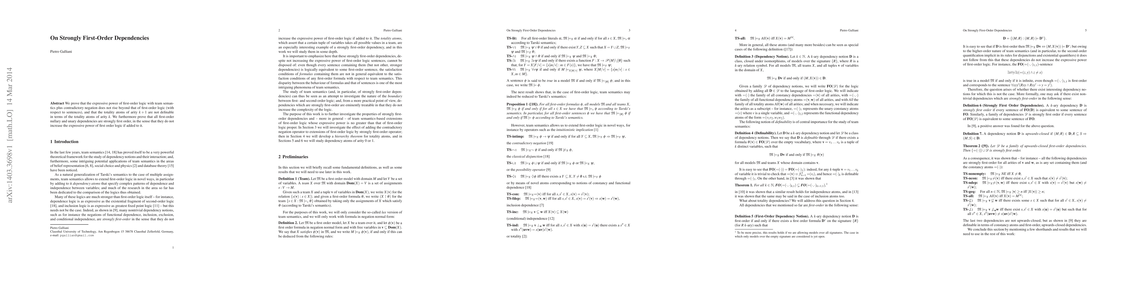 We prove that the expressive power of first-order logic with team semantics plus contradictory negation does not rise beyond that of first-order logic (with respect to sentences), and that the totality atoms of arity k +1 are not definable in terms of the totality atoms of arity k. We furthermore prove that all first-order nullary and unary dependencies are strongly first order, in the sense that they do not increase the expressive power of first order logic if added to it.