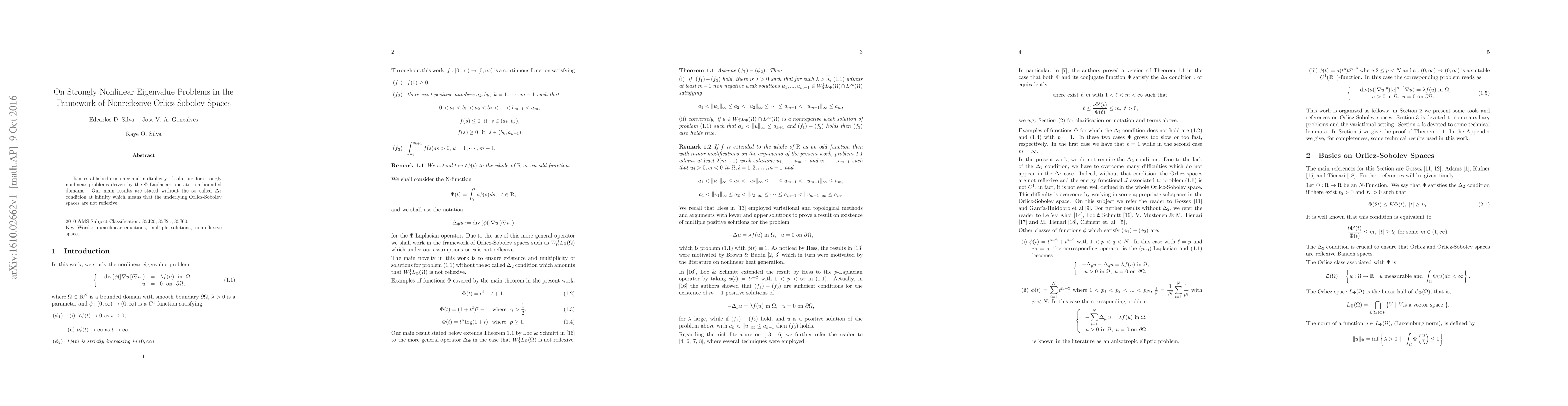 Summary: This paper establishes the existence and multiplicity of solutions for strongly nonlinear eigenvalue problems governed by the $\Phi$-Laplacian operator in nonreflexive Orlicz-Sobolev spaces, without requiring the $\Delta_{2}$ condition at infinity.