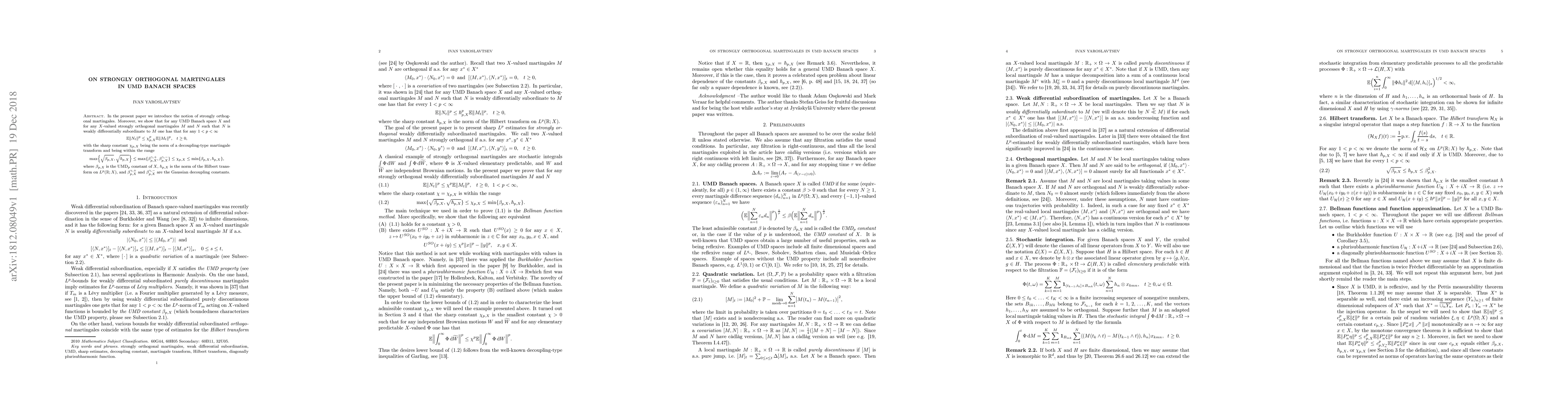 In the present paper we introduce the notion of strongly orthogonal martingales. Moreover, we show that for any UMD Banach space $X$ and for any $X$-valued strongly orthogonal martingales $M$ and $N$ such that $N$ is weakly differentially subordinate to $M$ one has that for any $1