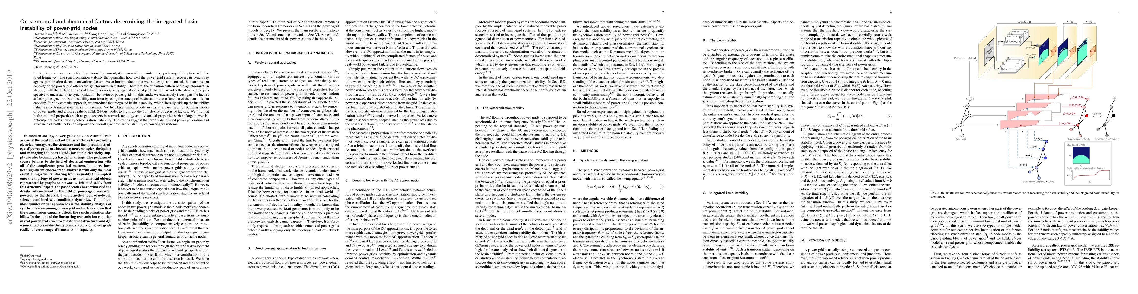 This paper investigates how structural and dynamical factors influence the synchronization stability of power-grid nodes, introducing the concept of integrated basin instability. It finds that both network topology features like gate keepers and large power inputs/outputs at nodes contribute to synchronization instability, suggesting that balanced power distribution and avoiding bottlenecks enhance overall stability.