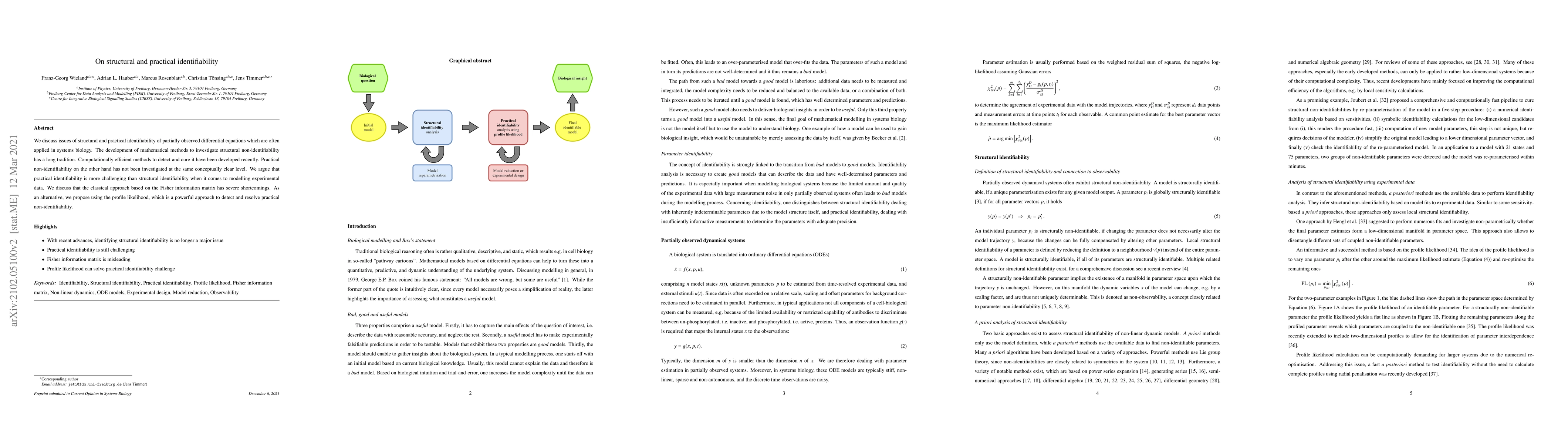 We discuss issues of structural and practical identifiability of partially observed differential equations which are often applied in systems biology. The development of mathematical methods to investigate structural non-identifiability has a long tradition. Computationally efficient methods to detect and cure it have been developed recently. Practical non-identifiability on the other hand has not been investigated at the same conceptually clear level. We argue that practical identifiability is more challenging than structural identifiability when it comes to modelling experimental data. We discuss that the classical approach based on the Fisher information matrix has severe shortcomings. As an alternative, we propose using the profile likelihood, which is a powerful approach to detect and resolve practical non-identifiability.