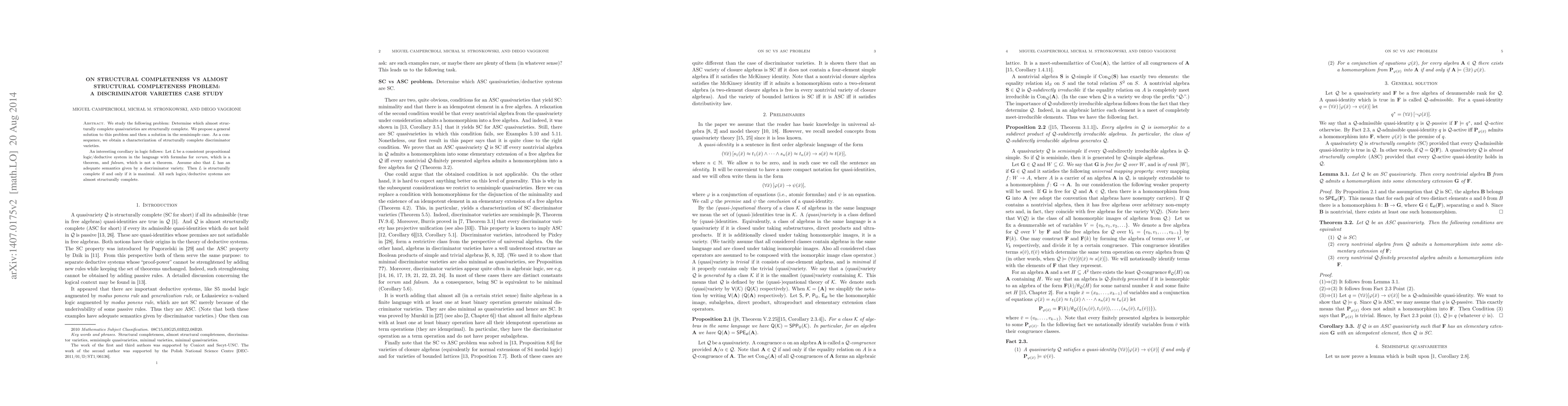 The paper studies the relationship between almost structurally complete quasivarieties and structurally complete discriminator varieties, providing a general solution and characterization of maximal logics/deductive systems.