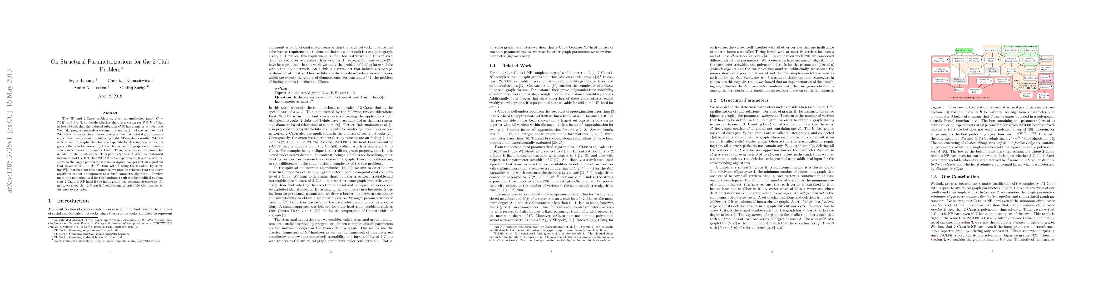 The NP-hard 2-Club problem is, given an undirected graph G=(V,E) and l\in N, to decide whether there is a vertex set S\subseteq V of size at least l such that the induced subgraph G[S] has diameter at most two. We make progress towards a systematic classification of the complexity of 2-Club with respect to a hierarchy of prominent structural graph parameters. First, we present the following tight NP-hardness results: 2-Club is NP-hard on graphs that become bipartite by deleting one vertex, on graphs that can be covered by three cliques, and on graphs with domination number two and diameter three. Then, we consider the parameter h-index of the input graph. This parameter is motivated by real-world instances and the fact that 2-Club is fixed-parameter tractable with respect to the larger parameter maximum degree. We present an algorithm that solves 2-Club in |V|^{f(k)} time with k being the h-index. By showing W[1]-hardness for this parameter, we provide evidence that the above algorithm cannot be improved to a fixed-parameter algorithm. Furthermore, the reduction used for this hardness result can be modified to show that 2-Club is NP-hard if the input graph has constant degeneracy. Finally, we show that 2-Club is fixed-parameter tractable with respect to distance to cographs.