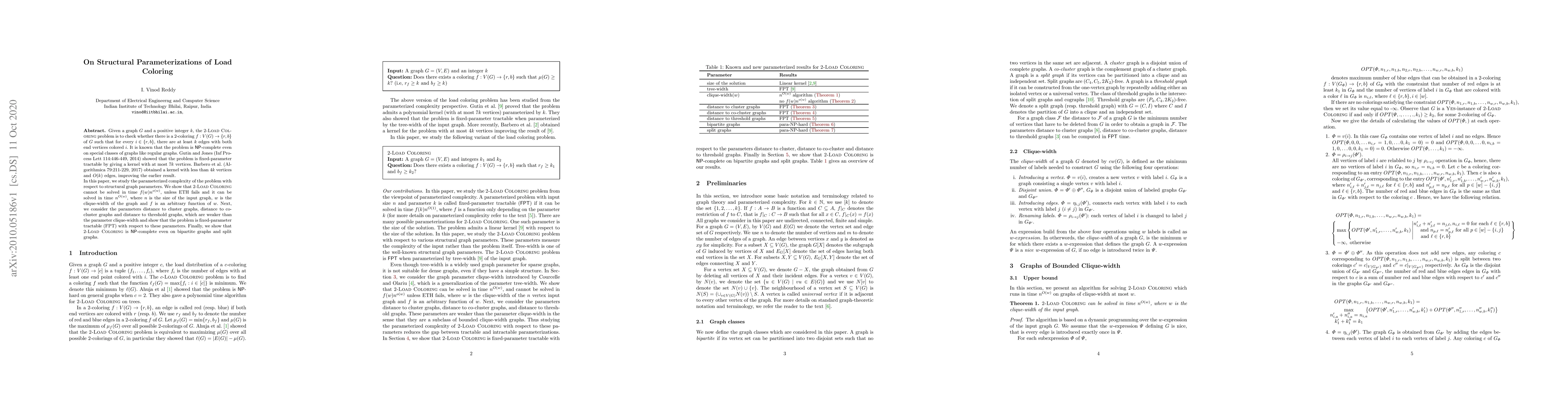 Given a graph $G$ and a positive integer $k$, the 2-Load coloring problem is to check whether there is a $2$-coloring $f:V(G) \rightarrow \{r,b\}$ of $G$ such that for every $i \in \{r,b\}$, there are at least $k$ edges with both end vertices colored $i$. It is known that the problem is NP-complete even on special classes of graphs like regular graphs. Gutin and Jones (Inf Process Lett 114:446-449, 2014) showed that the problem is fixed-parameter tractable by giving a kernel with at most $7k$ vertices. Barbero et al. (Algorithmica 79:211-229, 2017) obtained a kernel with less than $4k$ vertices and $O(k)$ edges, improving the earlier result. In this paper, we study the parameterized complexity of the problem with respect to structural graph parameters. We show that \lcp{} cannot be solved in time $f(w)n^{o(w)}$, unless ETH fails and it can be solved in time $n^{O(w)}$, where $n$ is the size of the input graph, $w$ is the clique-width of the graph and $f$ is an arbitrary function of $w$. Next, we consider the parameters distance to cluster graphs, distance to co-cluster graphs and distance to threshold graphs, which are weaker than the parameter clique-width and show that the problem is fixed-parameter tractable (FPT) with respect to these parameters. Finally, we show that \lcp{} is NP-complete even on bipartite graphs and split graphs.