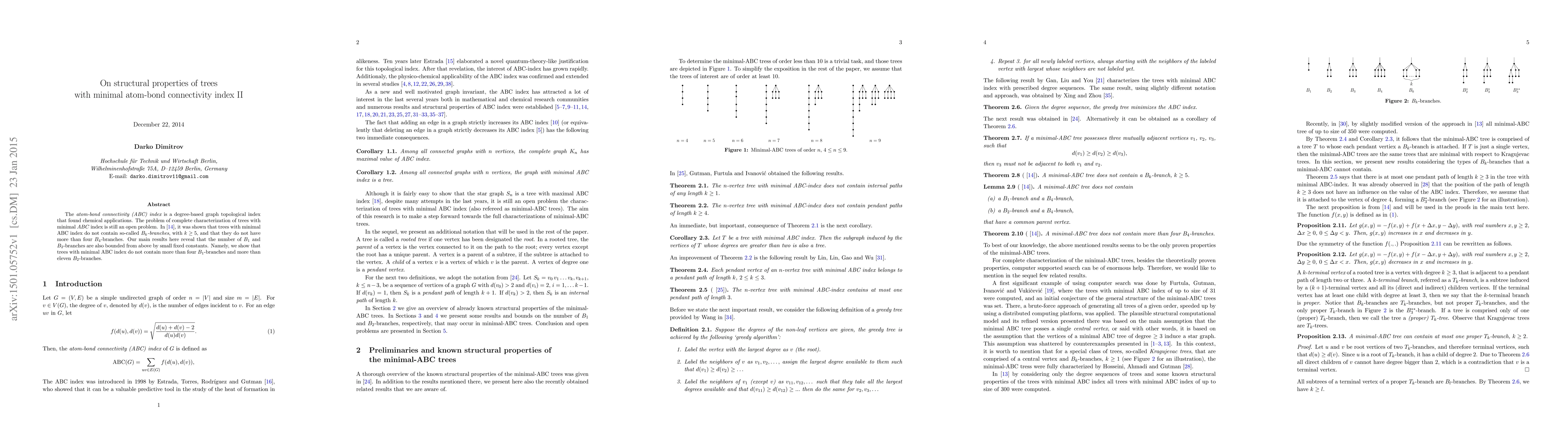 The {\em atom-bond connectivity (ABC) index} is a degree-based graph topological index that found chemical applications. The problem of complete characterization of trees with minimal $ABC$ index is still an open problem. In~\cite{d-sptmabci-2014}, it was shown that trees with minimal ABC index do not contain so-called {\em $B_k$-branches}, with $k \geq 5$, and that they do not have more than four $B_4$-branches. Our main results here reveal that the number of $B_1$ and $B_2$-branches are also bounded from above by small fixed constants. Namely, we show that trees with minimal ABC index do not contain more than four $B_1$-branches and more than eleven $B_2$-branches.