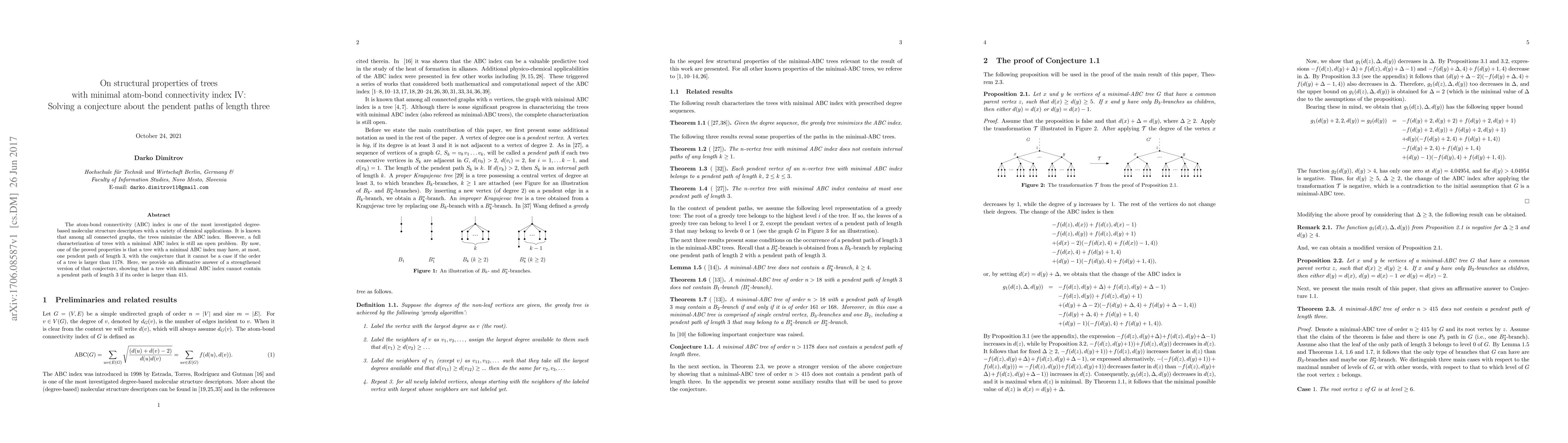 The atom-bond connectivity (ABC) index is one of the most investigated degree-based molecular structure descriptors with a variety of chemical applications. It is known that among all connected graphs, the trees minimize the ABC index. However, a full characterization of trees with a minimal ABC index is still an open problem. By now, one of the proved properties is that a tree with a minimal ABC index may have, at most, one pendent path of length $3$, with the conjecture that it cannot be a case if the order of a tree is larger than $1178$. Here, we provide an affirmative answer of a strengthened version of that conjecture, showing that a tree with minimal ABC index cannot contain a pendent path of length $3$ if its order is larger than $415$.
