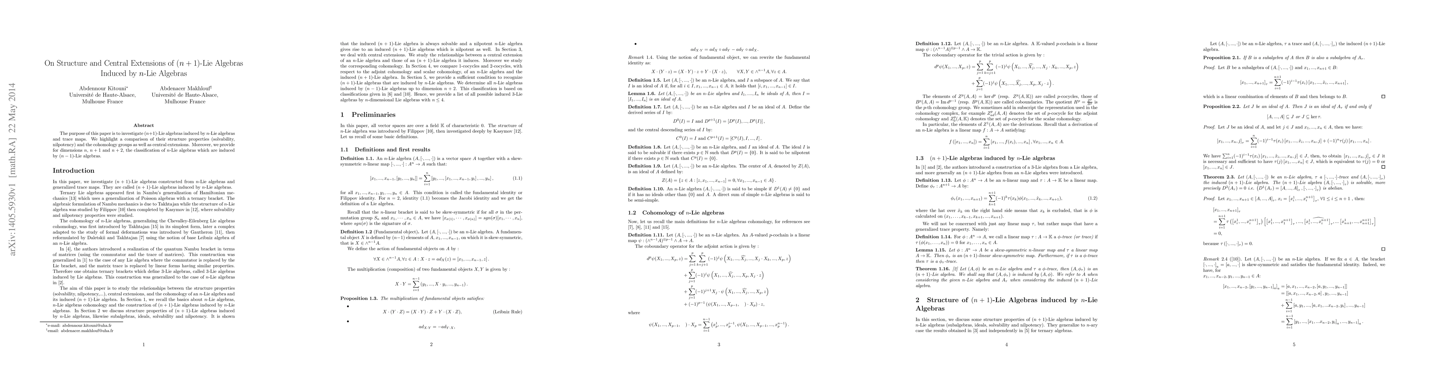 This paper explores the structure and central extensions of $(n+1)$-Lie algebras derived from $n$-Lie algebras through trace maps, comparing their solvability, nilpotency, and cohomology groups. It also classifies $n$-Lie algebras induced by $(n-1)$-Lie algebras for dimensions $n$, $n+1$, and $n+2$.