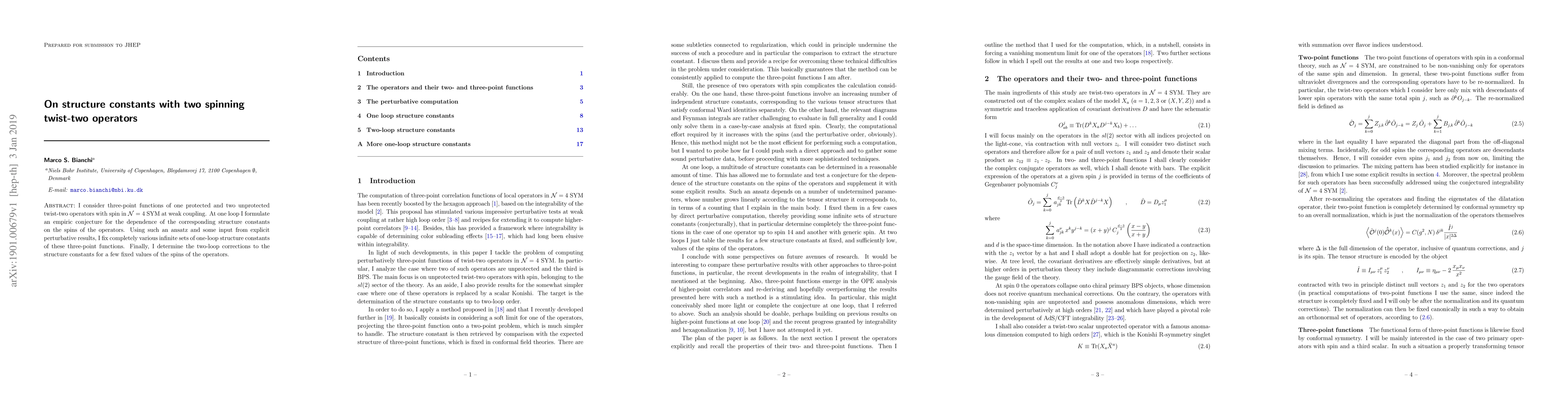 This paper formulates an empirical conjecture for the structure constants in N=4 SYM at one loop for three-point functions involving one protected and two unprotected twist-two operators with spin. The conjecture is used to determine various infinite sets of one-loop structure constants and computes two-loop corrections for specific spin values.
