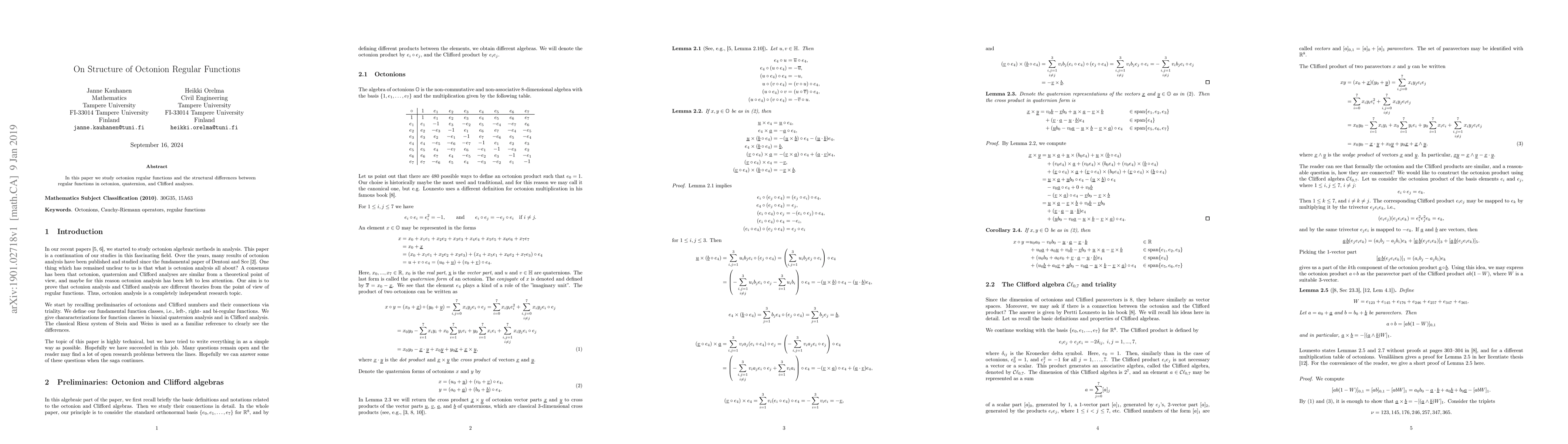 In this paper we study octonion regular functions and the structural differences between regular functions in octonion, quaternion, and Clifford analyses.