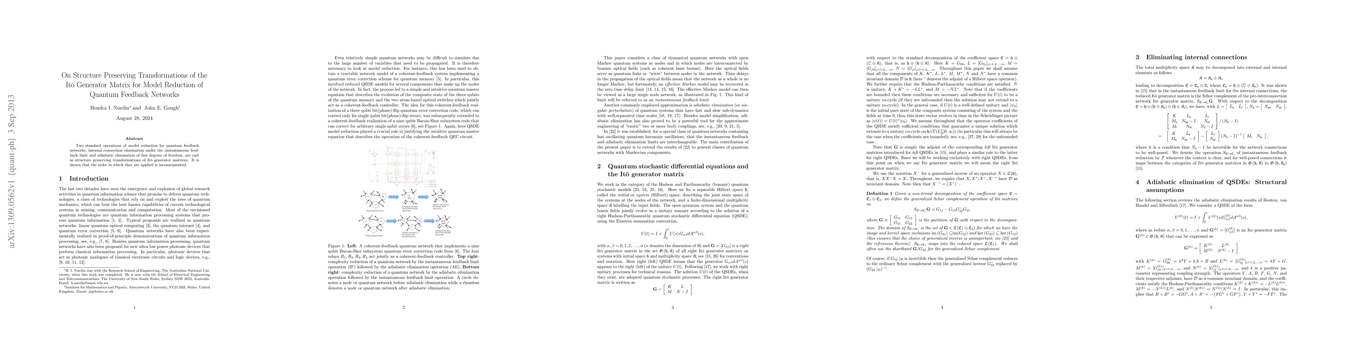 This paper explores model reduction techniques for quantum feedback networks by transforming Ito generator matrices, demonstrating that eliminating internal connections and adiabatically eliminating fast degrees of freedom can be done in any order without affecting the structural integrity of the transformations.