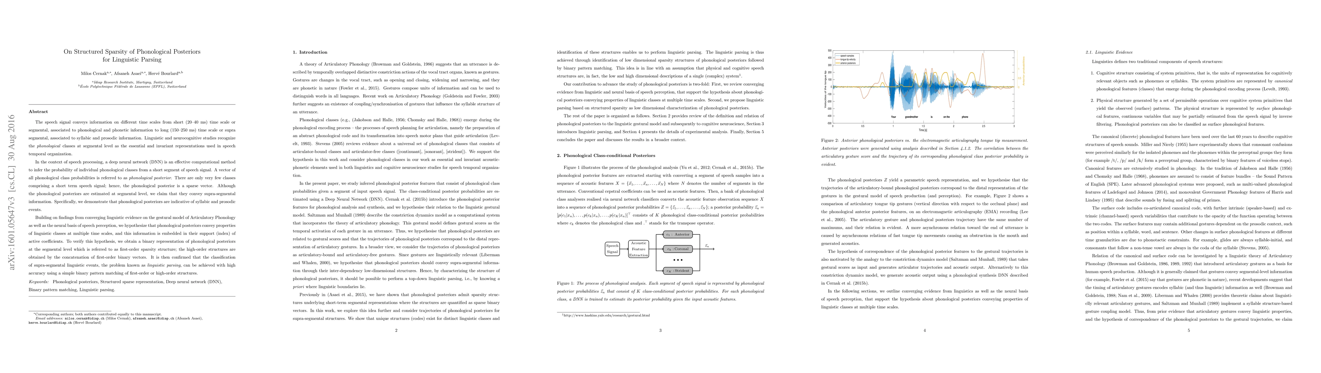 The speech signal conveys information on different time scales from short time scale or segmental, associated to phonological and phonetic information to long time scale or supra segmental, associated to syllabic and prosodic information. Linguistic and neurocognitive studies recognize the phonological classes at segmental level as the essential and invariant representations used in speech temporal organization. In the context of speech processing, a deep neural network (DNN) is an effective computational method to infer the probability of individual phonological classes from a short segment of speech signal. A vector of all phonological class probabilities is referred to as phonological posterior. There are only very few classes comprising a short term speech signal; hence, the phonological posterior is a sparse vector. Although the phonological posteriors are estimated at segmental level, we claim that they convey supra-segmental information. Specifically, we demonstrate that phonological posteriors are indicative of syllabic and prosodic events. Building on findings from converging linguistic evidence on the gestural model of Articulatory Phonology as well as the neural basis of speech perception, we hypothesize that phonological posteriors convey properties of linguistic classes at multiple time scales, and this information is embedded in their support (index) of active coefficients. To verify this hypothesis, we obtain a binary representation of phonological posteriors at the segmental level which is referred to as first-order sparsity structure; the high-order structures are obtained by the concatenation of first-order binary vectors. It is then confirmed that the classification of supra-segmental linguistic events, the problem known as linguistic parsing, can be achieved with high accuracy using asimple binary pattern matching of first-order or high-order structures.