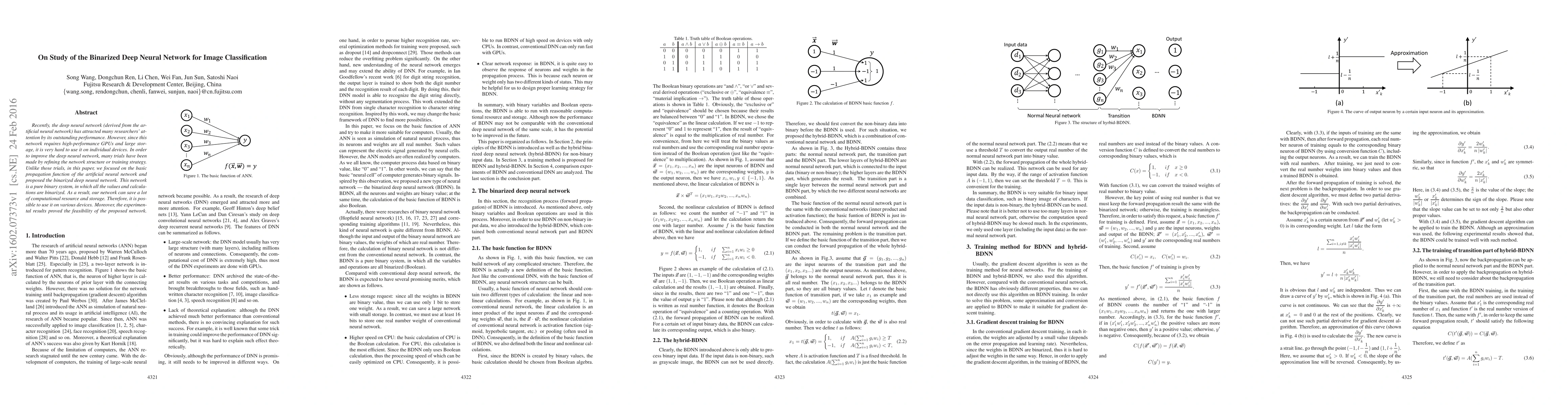This paper proposes a binarized deep neural network that uses only binary values and calculations, significantly reducing computational resource and storage requirements, making it feasible for use on individual devices. Experimental results demonstrate the network's effectiveness in image classification.
