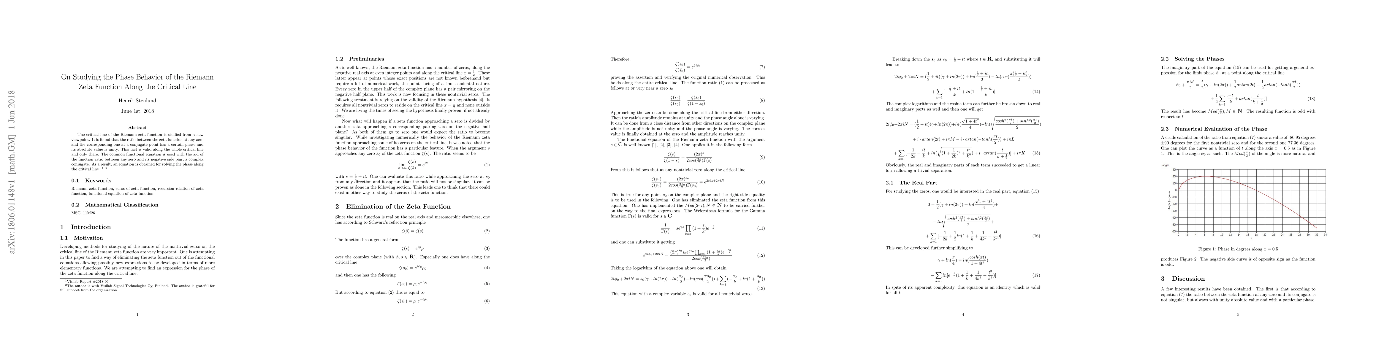 The study reveals a unique phase behavior of the Riemann zeta function along the critical line, where the ratio of the zeta function at any zero and its conjugate has a phase with a unity absolute value. This behavior is exclusively valid along the critical line and is derived using the functional equation and the ratio of zeros to their conjugates.