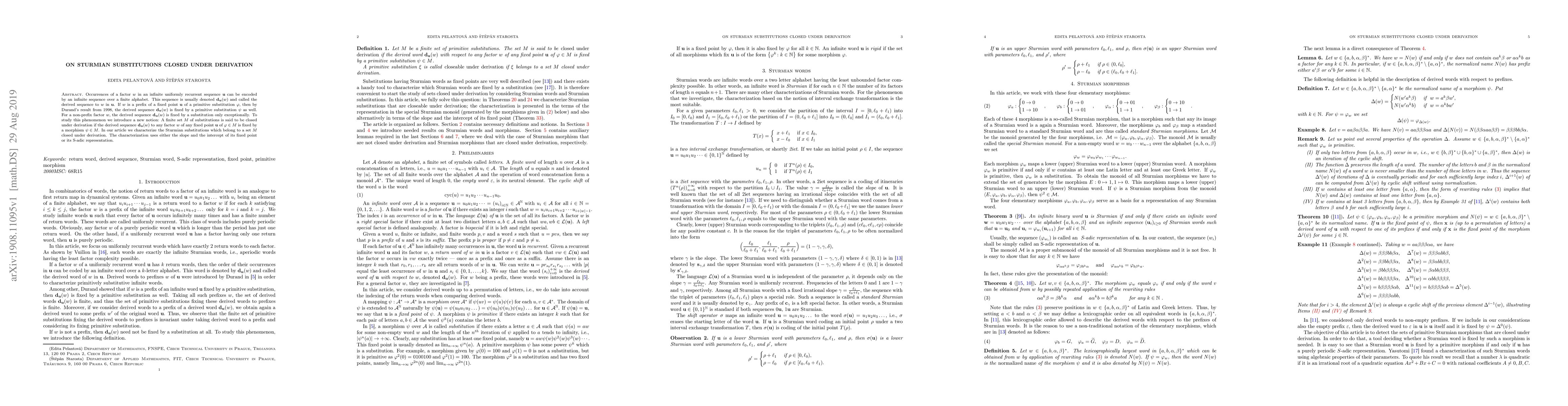 Occurrences of a factor $w$ in an infinite uniformly recurrent sequence ${\bf u}$ can be encoded by an infinite sequence over a finite alphabet. This sequence is usually denoted ${\bf d_{\bf u}}(w)$ and called the derived sequence to $w$ in ${\bf u}$. If $w$ is a prefix of a fixed point ${\bf u}$ of a primitive substitution $\varphi$, then by Durand's result from 1998, the derived sequence ${\bf d_{\bf u}}(w)$ is fixed by a primitive substitution $\psi$ as well. For a non-prefix factor $w$, the derived sequence ${\bf d_{\bf u}}(w)$ is fixed by a substitution only exceptionally. To study this phenomenon we introduce a new notion: A finite set $M $ of substitutions is said to be closed under derivation if the derived sequence ${\bf d_{\bf u}}(w)$ to any factor $w$ of any fixed point ${\bf u}$ of $\varphi \in M$ is fixed by a morphism $\psi \in M$. In our article we characterize the Sturmian substitutions which belong to a set $M$ closed under derivation. The characterization uses either the slope and the intercept of its fixed point or its S-adic representation.