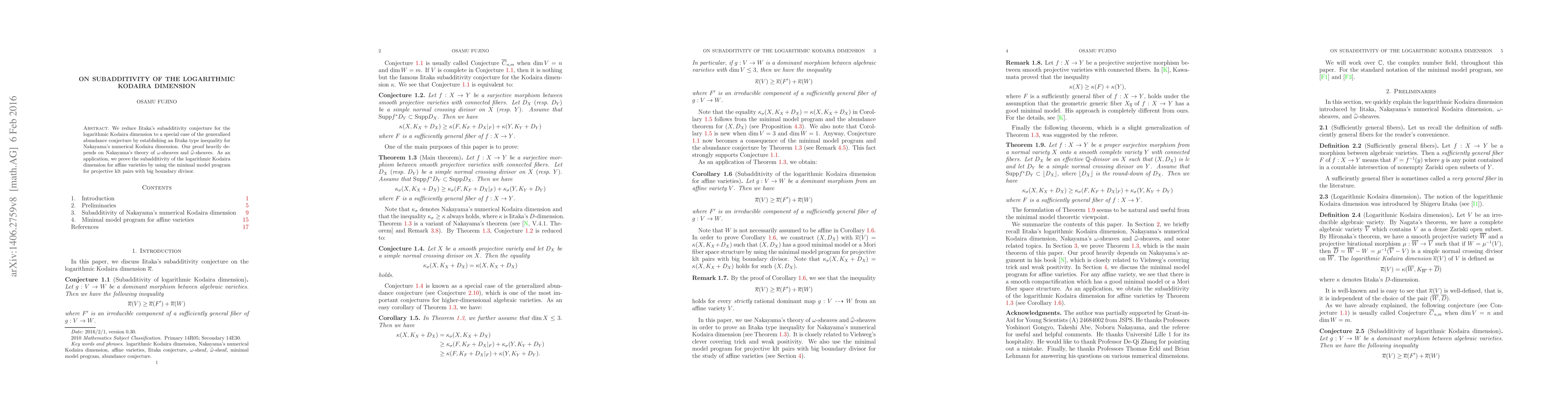 This paper proves Iitaka's subadditivity conjecture for logarithmic Kodaira dimension by reducing it to a generalized abundance conjecture, using Nakayama's theory of $\omega$-sheaves and $\widehat{\omega}$-sheaves. It also applies the minimal model program to demonstrate the conjecture for affine varieties.