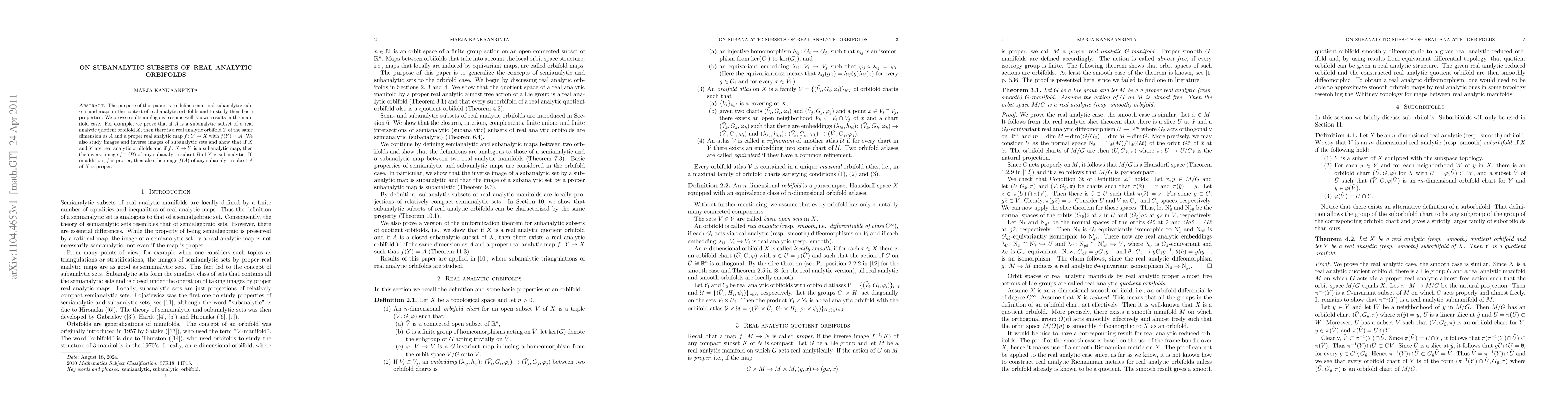 This paper defines semi- and subanalytic subsets and maps in real analytic orbifolds, proving results analogous to those in the manifold case, including the existence of a proper real analytic map from an orbifold to a subanalytic subset. It also shows that inverse images of subanalytic sets under subanalytic maps are subanalytic, and proper subanalytic maps preserve the property of being proper.