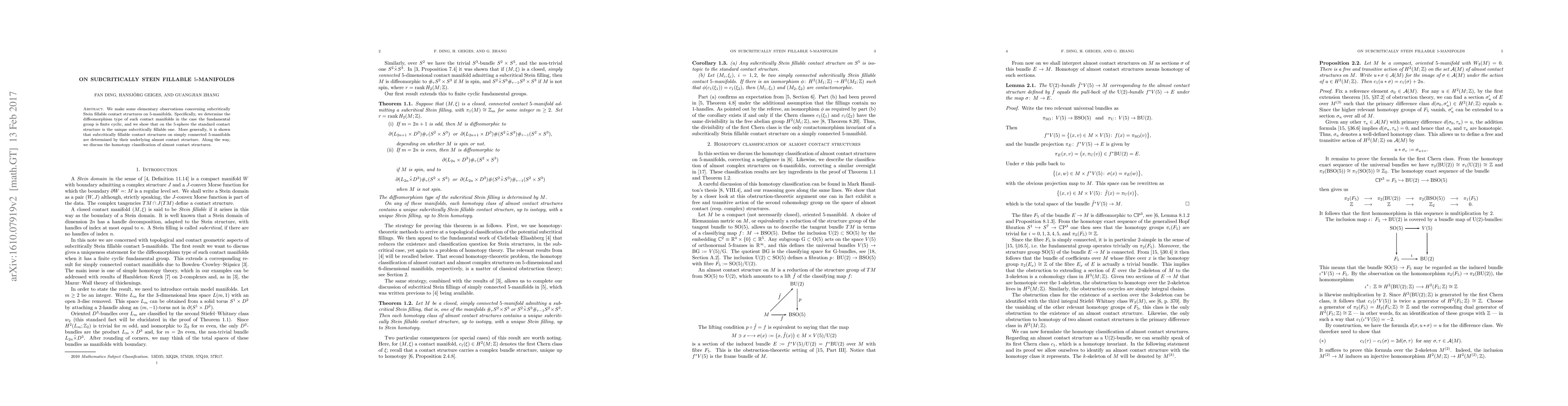 We make some elementary observations concerning subcritically Stein fillable contact structures on 5-manifolds. Specifically, we determine the diffeomorphism type of such contact manifolds in the case the fundamental group is finite cyclic, and we show that on the 5-sphere the standard contact structure is the unique subcritically fillable one. More generally, it is shown that subcritically fillable contact structures on simply connected 5-manifolds are determined by their underlying almost contact structure. Along the way, we discuss the homotopy classification of almost contact structures.