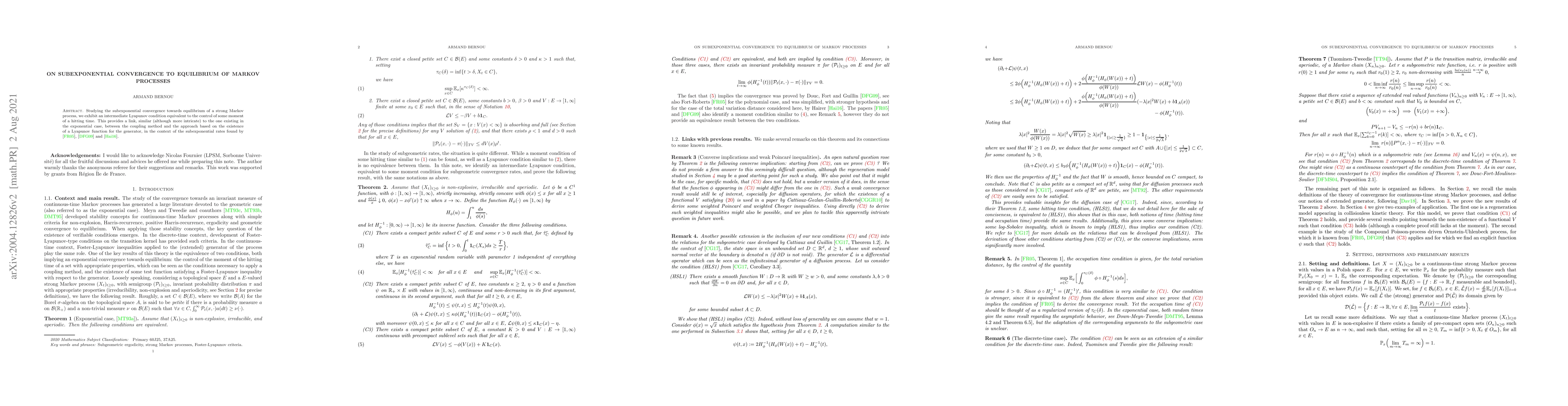 This paper explores subexponential convergence to equilibrium in strong Markov processes, establishing an intermediate Lyapunov condition that controls a moment of a hitting time, thereby linking the coupling method with Lyapunov function approaches in the context of subexponential rates.