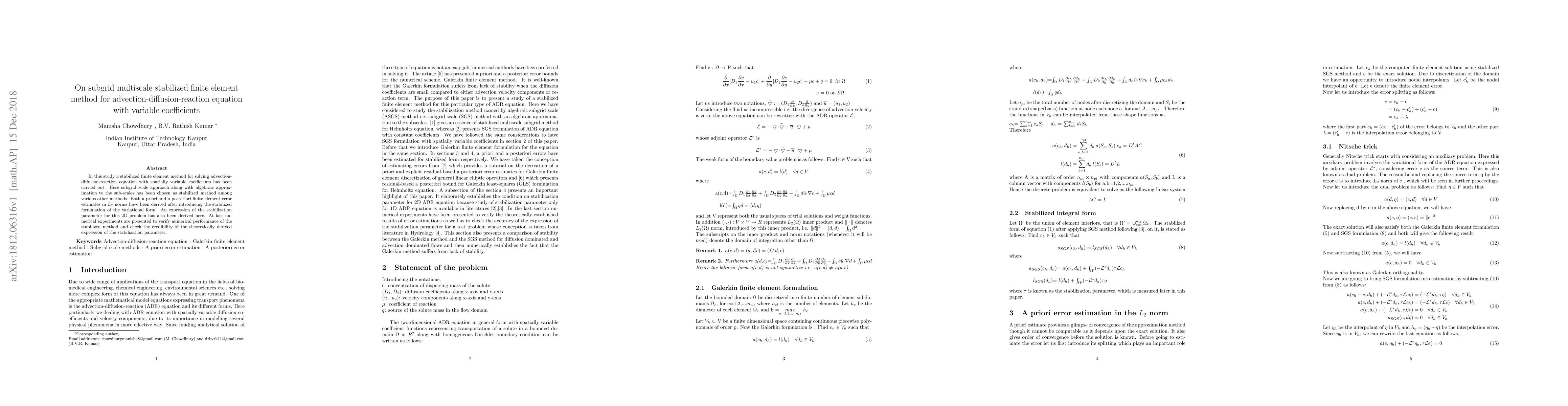 This paper develops a subgrid multiscale stabilized finite element method for solving advection-diffusion-reaction equations with variable coefficients. The study derives a priori and a posteriori error estimates and presents numerical experiments to validate the method's performance and the derived stabilization parameter.