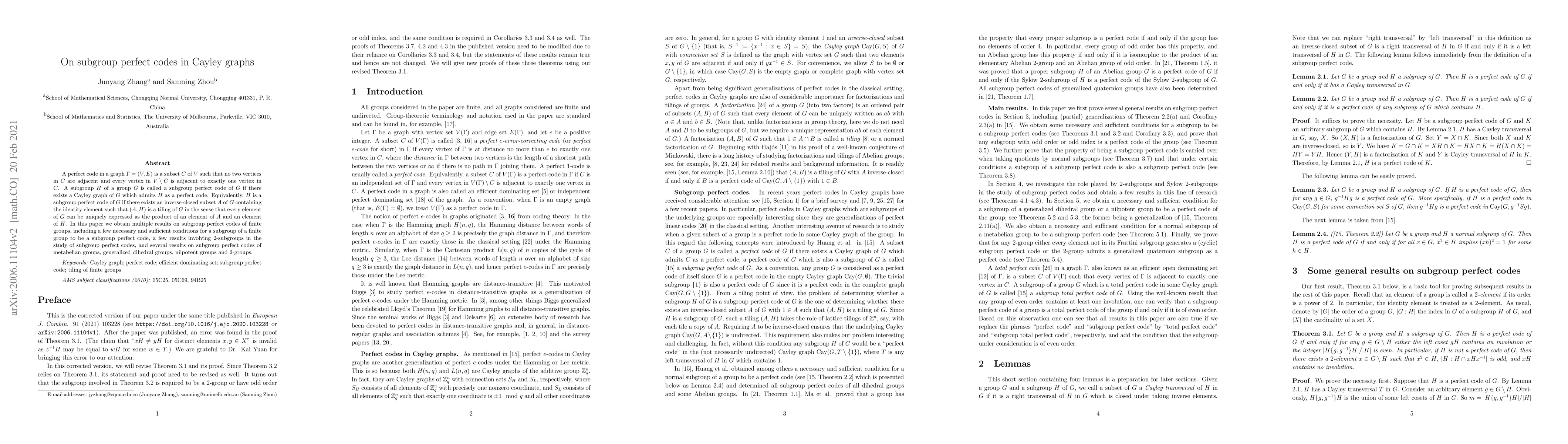This paper explores subgroup perfect codes in Cayley graphs, providing necessary and sufficient conditions for a subgroup to be a perfect code, focusing on $2$-subgroups, and presenting results for metabelian, generalized dihedral, nilpotent, and $2$-groups.