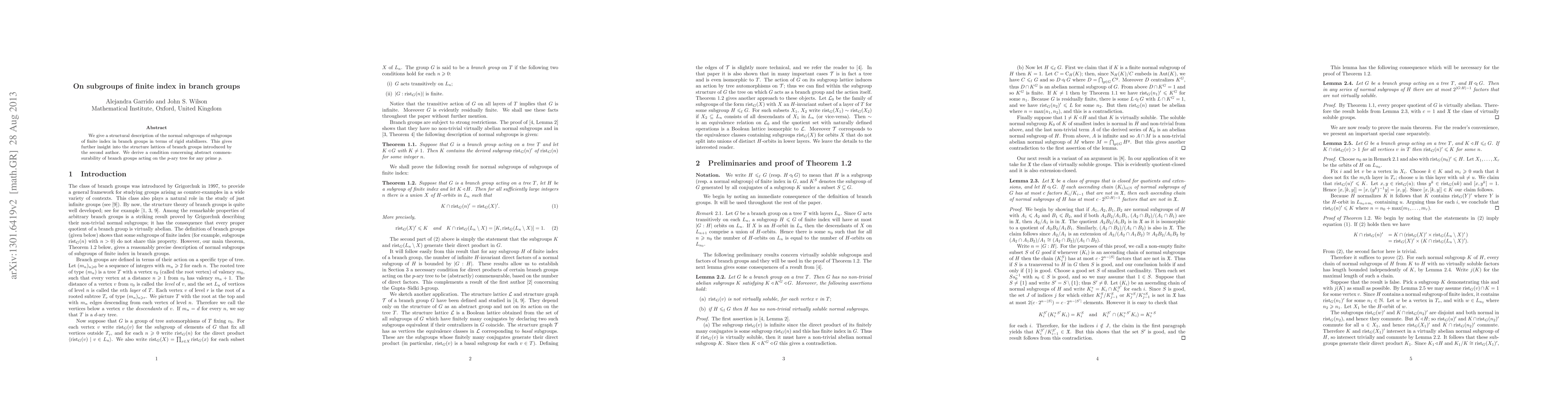 This paper provides a structural analysis of normal subgroups within subgroups of finite index in branch groups, defining them via rigid stabilizers. It also establishes a condition for the abstract commensurability of branch groups acting on the p-ary tree for any prime p.