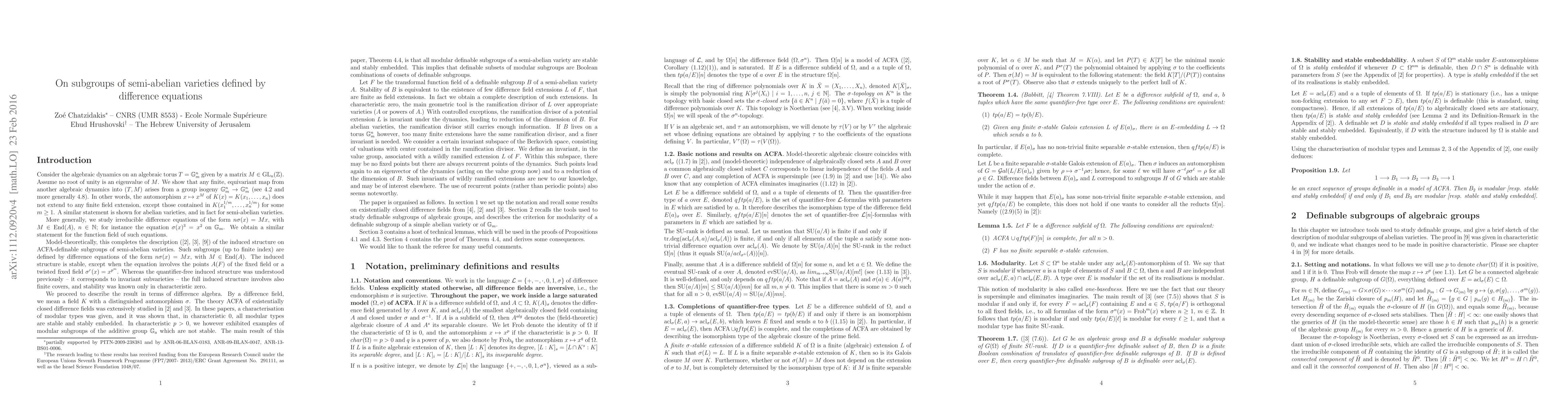 This paper proves that finite equivariant maps between algebraic dynamics on tori are derived from finite isogenies, extending this result to semi-abelian varieties. It also establishes stability and stable embedding for definable subgroups in existentially closed difference fields, with implications for definable subsets in positive characteristic.