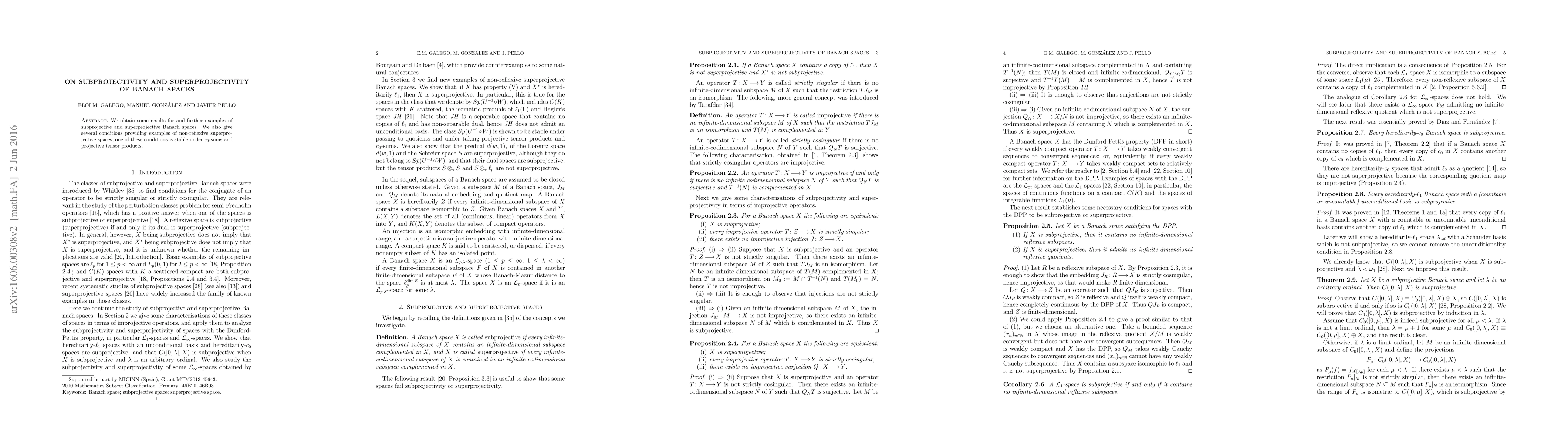 This paper explores subprojective and superprojective Banach spaces, providing new examples and conditions for non-reflexive superprojective spaces, including one condition that remains stable under $c_0$-sums and projective tensor products.