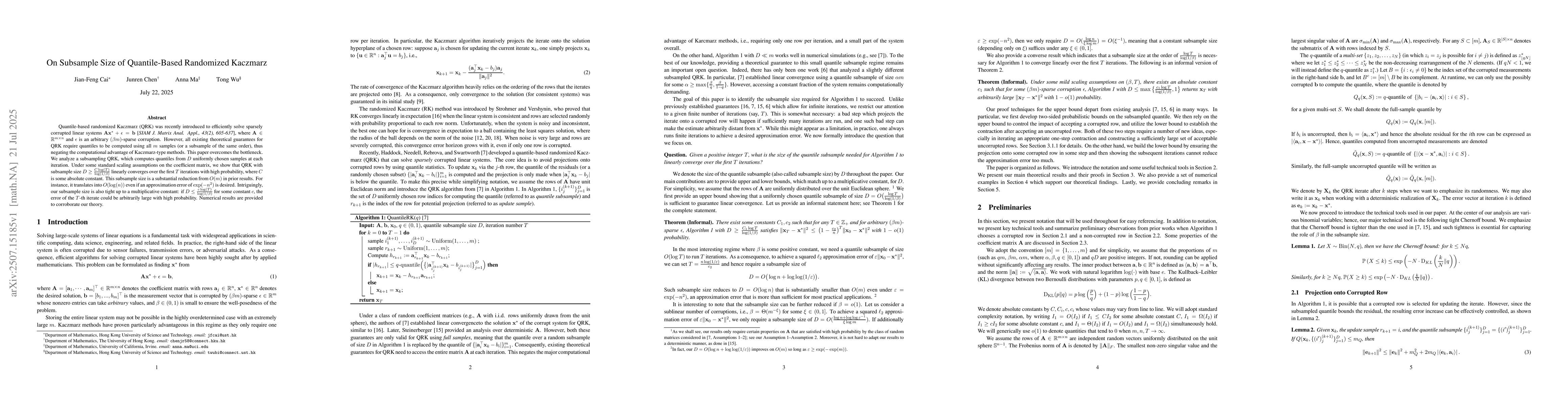 This paper analyzes a subsampling version of Quantile-based Randomized Kaczmarz (QRK) for solving sparsely corrupted linear systems, showing that it converges linearly with a reduced subsample size D ≥ C log(T) / log(1/β) compared to previous results requiring O(m) samples.