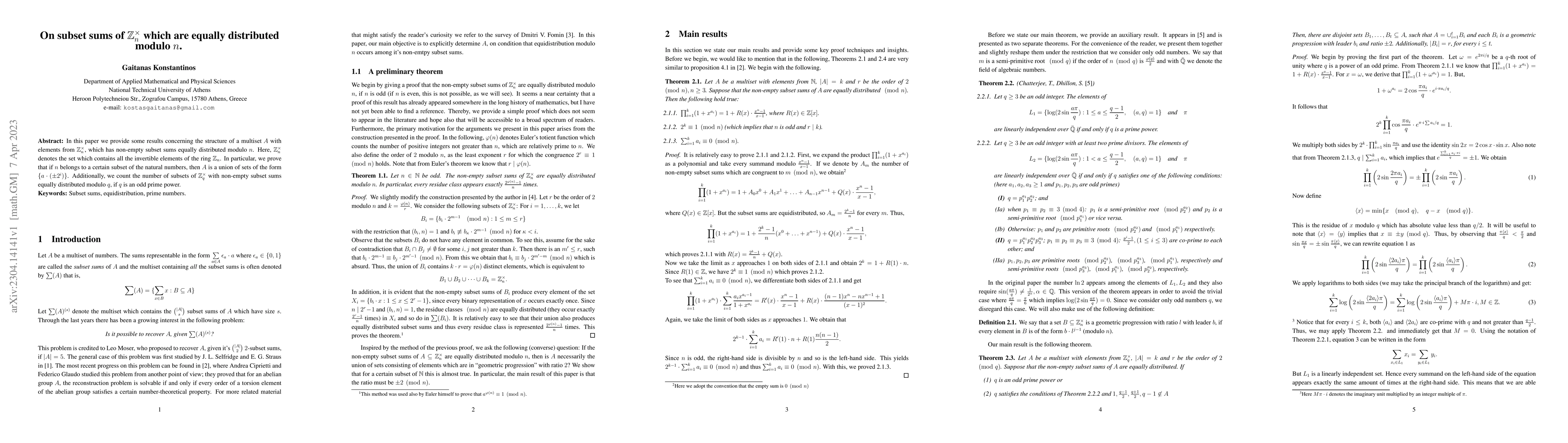This paper investigates sets $A \subseteq \mathbb{Z}_n^{\times}$ where non-empty subset sums are equally distributed modulo $n$. It proves that if $n=q$ is a power of an odd prime, then $A$ is a union of sets of the form $\{ a\cdot(\pm2^i)\}$, and counts such subsets in $\mathbb{Z}_q^{\times}$.