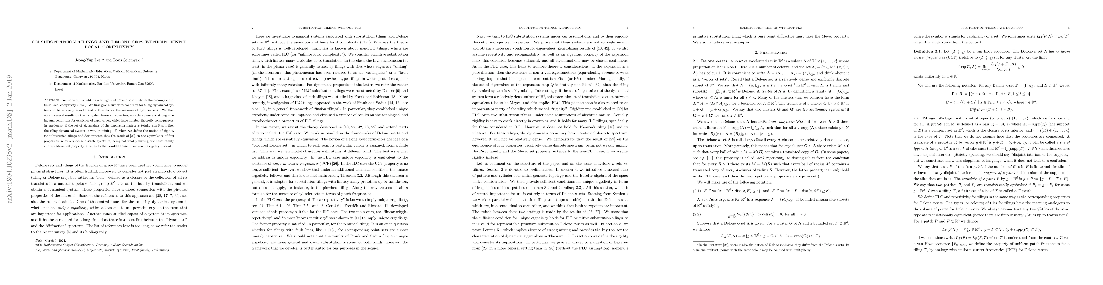 This paper explores substitution tilings and Delone sets without finite local complexity, providing a condition for unique ergodicity and measure of cylinder sets. It discusses ergodic properties, including absence of strong mixing, and conditions for eigenvalue existence, revealing number-theoretic implications, particularly weak mixing in non-Pisot sets. It also extends rigidity results to the non-FLC case.
