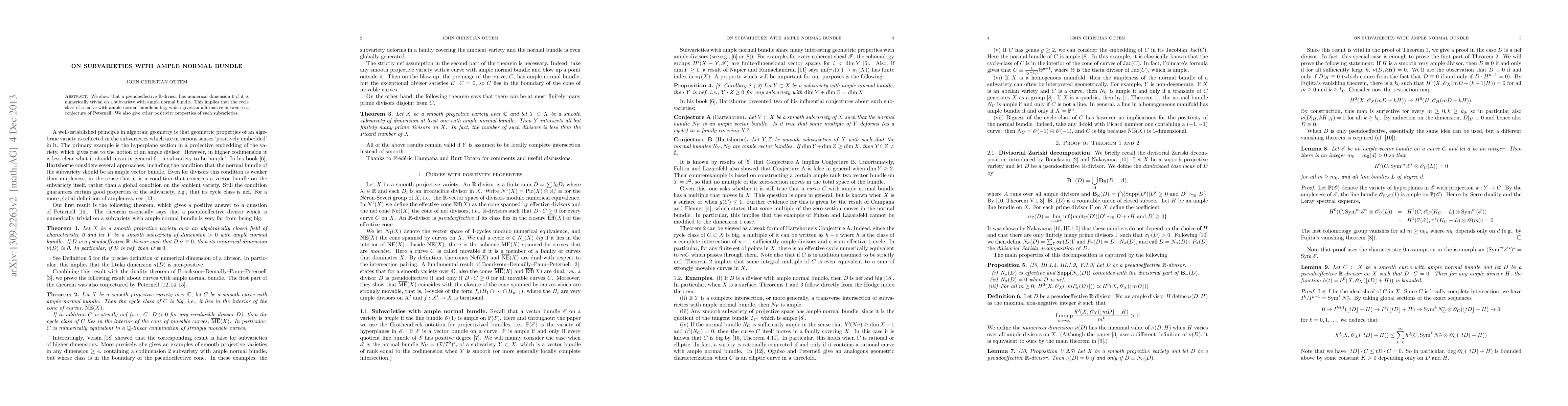We show that a pseudoeffective R-divisor has numerical dimension 0 if it is numerically trivial on a subvariety with ample normal bundle. This implies that the cycle class of a curve with ample normal bundle is big, giving an affirmative answer to a question of Peternell. We also give other positivity properties such subvarieties.