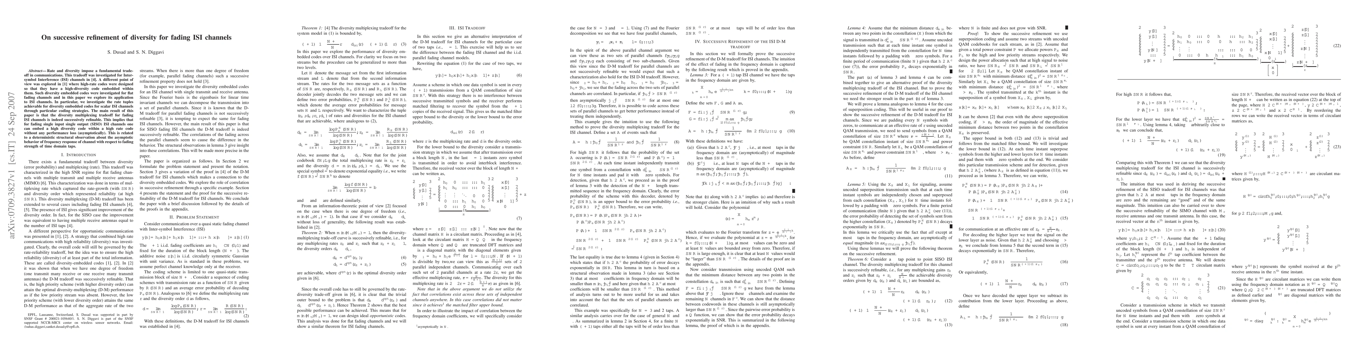 This paper investigates the successive refinement of diversity for fading Intersymbol Interference (ISI) channels, demonstrating that high-rate codes can embed high diversity codes without performance loss asymptotically. The key finding is that the diversity multiplexing tradeoff for such channels is successively refinable.