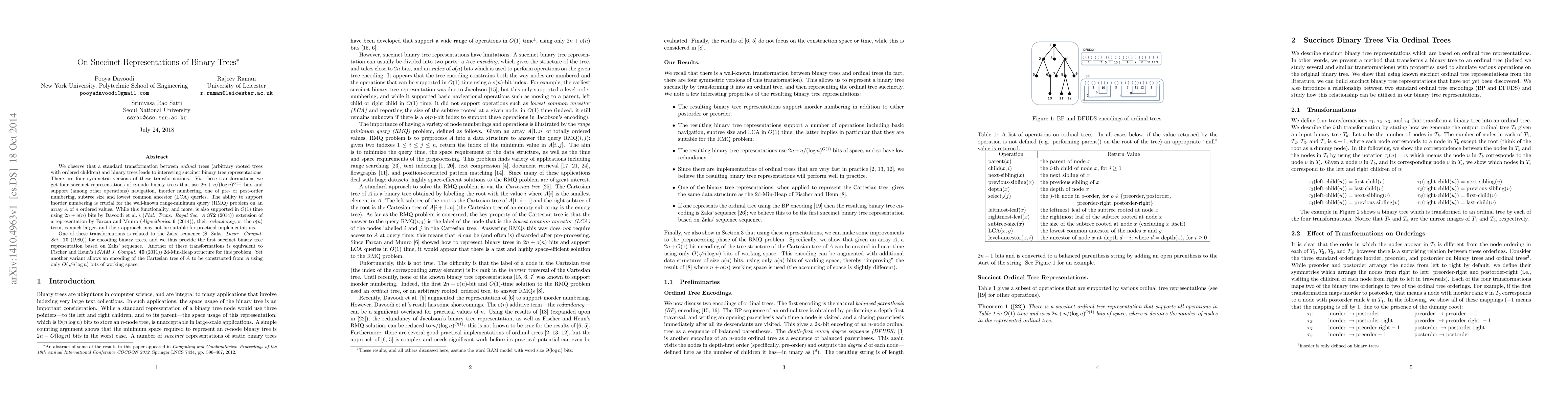 This paper explores succinct binary tree representations derived from transformations of ordinal trees, achieving $2n + n/(\log n)^{O(1)}$ bits while supporting various operations. It introduces four symmetric transformations, including one based on Zaks' sequence and another equivalent to Fischer and Heun's minheap structure, offering practical advantages over existing methods.