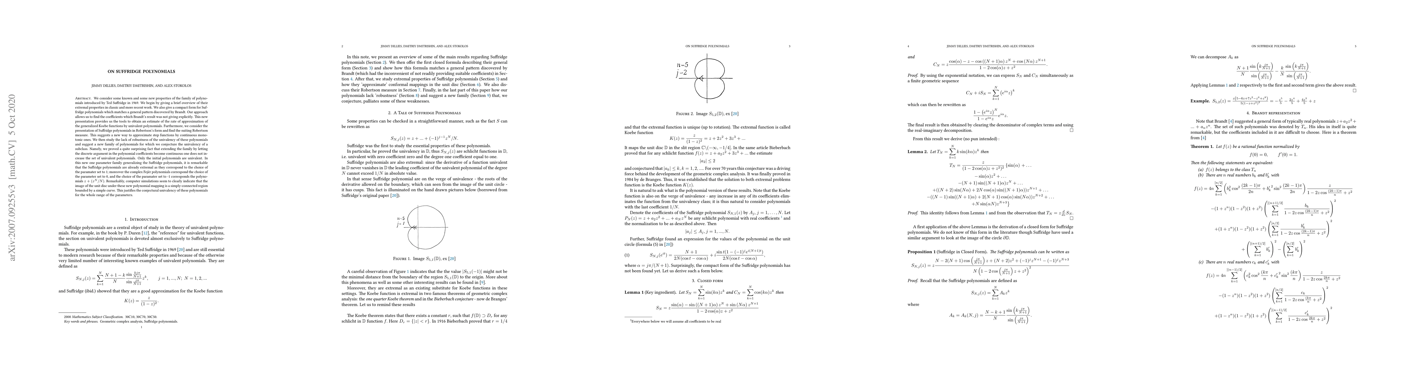 We consider some known and some new properties of the family of polynomials introduced by Ted Suffridge in 1969. We begin by giving a brief overview of their extremal properties in classic and more recent work. We also give a compact form for Suffridge polynomials which matches a general pattern discovered by Brandt. Our approach allows us to find the coefficients which Brandt's result was not giving explicitly. This new presentation provides us the tools to obtain an estimate of the rate of approximation of the generalized Koebe functions by univalent polynomials. Furthermore, we consider the presentation of Suffridge polynomials in Robertson's form and find the suiting Robertson measure. This suggests a new way to approximate step functions by continuous monotonic ones. We then study the lack of robustness of the univalency of these polynomials and suggest a new family of polynomials for which we conjecture the univalency of a subclass. Namely, we prove the quite surprising fact that by extending the family by letting the discrete argument in the polynomial coefficients become continuous one does not increase the set of univalent polynomials. Only the initial polynomials remain univalent. In this new one parameter family generalizing the Suffridge polynomials, it is remarkable that the Suffridge polynomials are already extremal as they correspond to the choice of the parameter set to 1; moreover the complex Fej\'er polynomials correspond the choice of the parameter set to 0, and the choice of the parameter set to -1 corresponds the polynomials $z+(z^N/N)$. Remarkably, computer simulations seem to clearly indicate that the image of the unit disc under these new polynomial mapping is a simply-connected region bounded by a simple curve. This justifies the conjectural univalency of these polynomials for the whole range of the parameters.