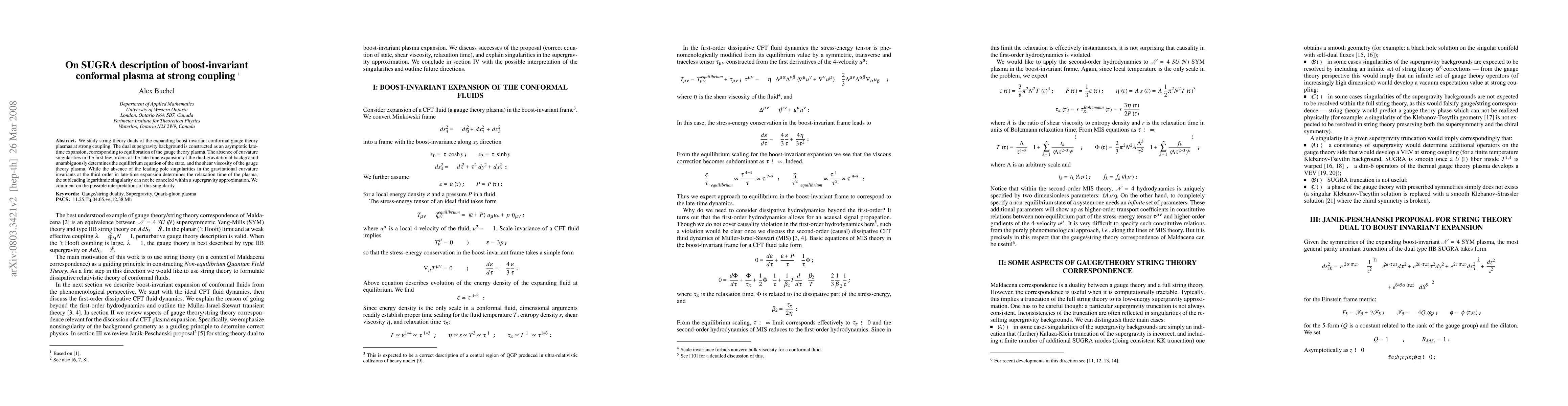 This paper investigates the dual string theory description of strongly coupled, expanding boost-invariant conformal gauge theory plasmas, constructing a supergravity background that represents the late-time equilibration of the plasma. The absence of curvature singularities in the supergravity expansion determines the equilibrium equation of state and shear viscosity, while the relaxation time is inferred from the absence of leading singularities in the gravitational curvature invariants.