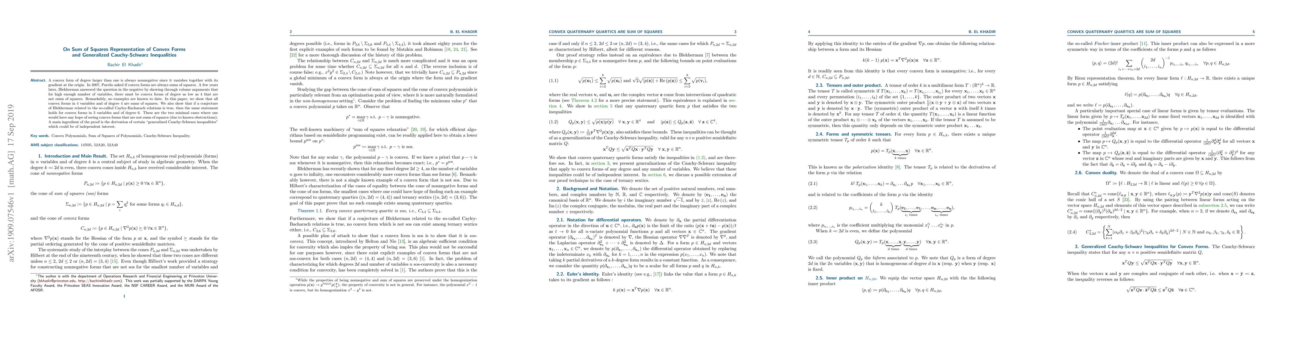 This paper demonstrates that all convex forms in 4 variables and of degree 4 are sums of squares, and suggests that if a conjecture by Blekherman holds, the same applies to convex forms in 3 variables and of degree 6. The proof utilizes the derivation of generalized Cauchy-Schwarz inequalities.
