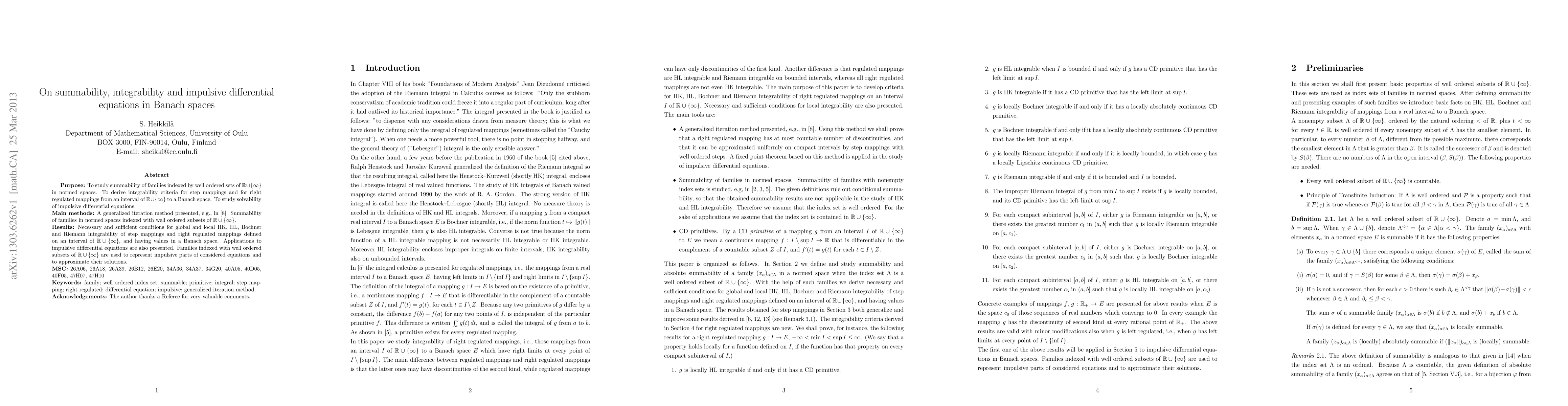 We shall first study summability of families in normed spaces indexed with well ordered sets of real numbers extended by infinity. Obtained results and a generalized iteration method are applied to derive necessary and sufficient conditions for HK, HL, Bochner and Riemann integrability of step mappings and for right regulated mappings from an interval of reals extended by infinity to a Banach space. Finally, solvability of impulsive differential equations are studied.