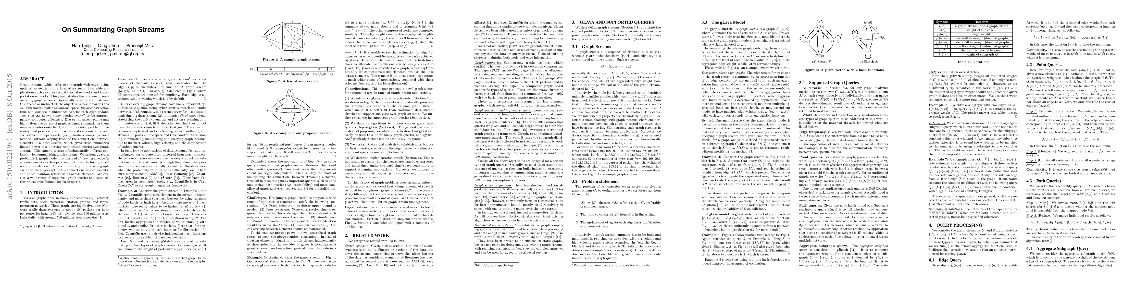 This paper introduces gLava, a probabilistic graph model for summarizing graph streams by focusing on nodes rather than edges, enabling efficient querying and maintaining relationships across updates, with theoretical error bounds for basic queries.