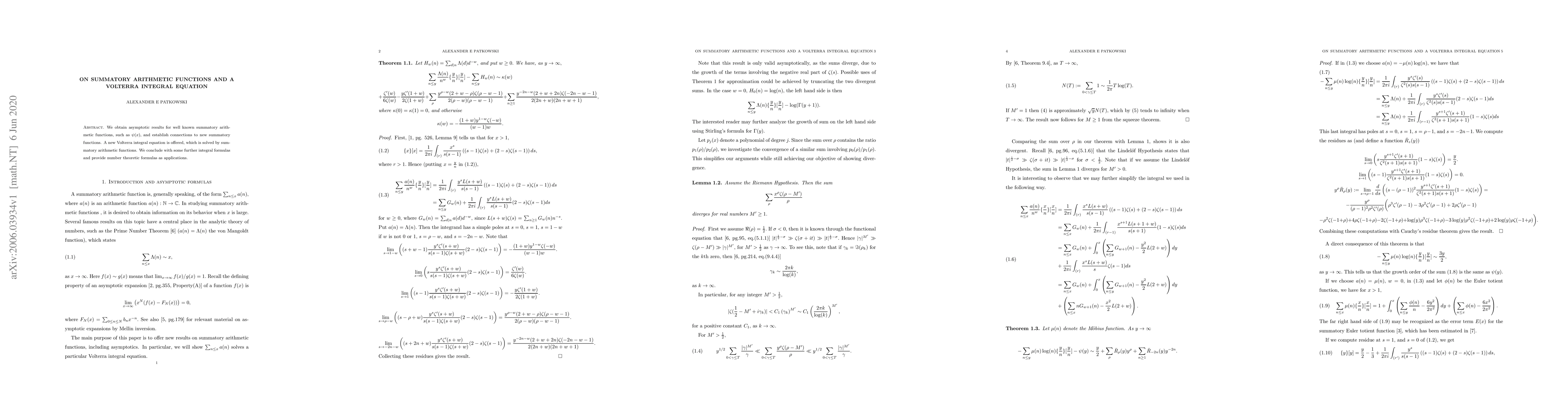 This paper investigates asymptotic results for summatory arithmetic functions like $\psi(x)$, establishing connections to new functions. It introduces and solves a novel Volterra integral equation linked to these functions, concluding with applications in number theory.