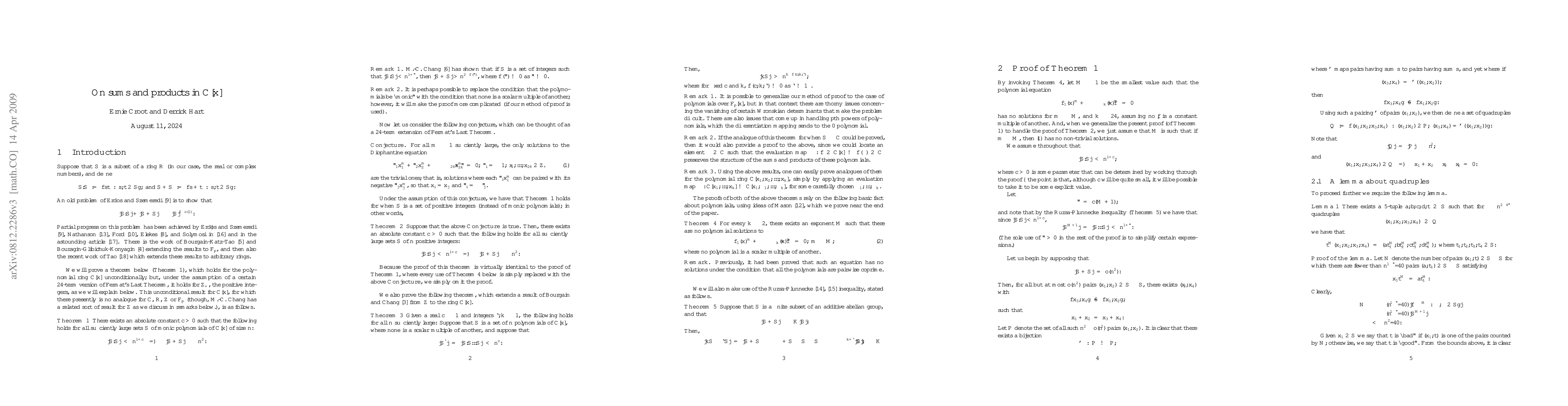 We show that under the assumption of a 24-term version of Fermat's Last Theorem, there exists an absolute constant c > 0 such that if S is a set of n > n_0 positive integers satisfying |S.S| < n^(1+c), then the sumset S.S satisfies |S+S| >> n^2. In other words, we prove a weak form of the Erdos-Szemeredi sum-product conjecture, conditional on an extension of Fermat's Last Theorem. Unconditionally, we prove this theorem for when S is a set of n monic polynomials. We also prove an analogue of a theorem of Bourgain and Chang for the ring C[x].