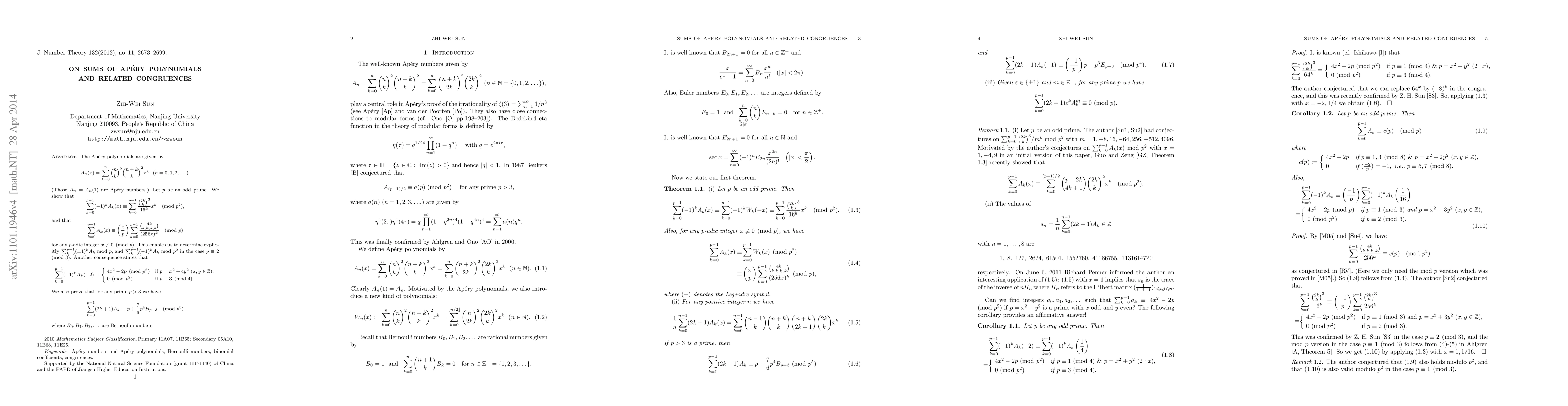 The Ap\'ery polynomials are given by $$A_n(x)=\sum_{k=0}^n\binom nk^2\binom{n+k}k^2x^k\ \ (n=0,1,2,\ldots).$$ (Those $A_n=A_n(1)$ are Ap\'ery numbers.) Let $p$ be an odd prime. We show that $$\sum_{k=0}^{p-1}(-1)^kA_k(x)\equiv\sum_{k=0}^{p-1}\frac{\binom{2k}k^3}{16^k}x^k\pmod{p^2},$$ and that $$\sum_{k=0}^{p-1}A_k(x)\equiv\left(\frac xp\right)\sum_{k=0}^{p-1}\frac{\binom{4k}{k,k,k,k}}{(256x)^k}\pmod{p}$$ for any $p$-adic integer $x\not\equiv 0\pmod p$. This enables us to determine explicitly $\sum_{k=0}^{p-1}(\pm1)^kA_k$ mod $p$, and $\sum_{k=0}^{p-1}(-1)^kA_k$ mod $p^2$ in the case $p\equiv 2\pmod3$. Another consequence states that $$\sum_{k=0}^{p-1}(-1)^kA_k(-2)\equiv\begin{cases}4x^2-2p\pmod{p^2}&\mbox{if}\ p=x^2+4y^2\ (x,y\in\mathbb Z),\\0\pmod{p^2}&\mbox{if}\ p\equiv3\pmod4.\end{cases}$$ We also prove that for any prime $p>3$ we have $$\sum_{k=0}^{p-1}(2k+1)A_k\equiv p+\frac 76p^4B_{p-3}\pmod{p^5}$$ where $B_0,B_1,B_2,\ldots$ are Bernoulli numbers.