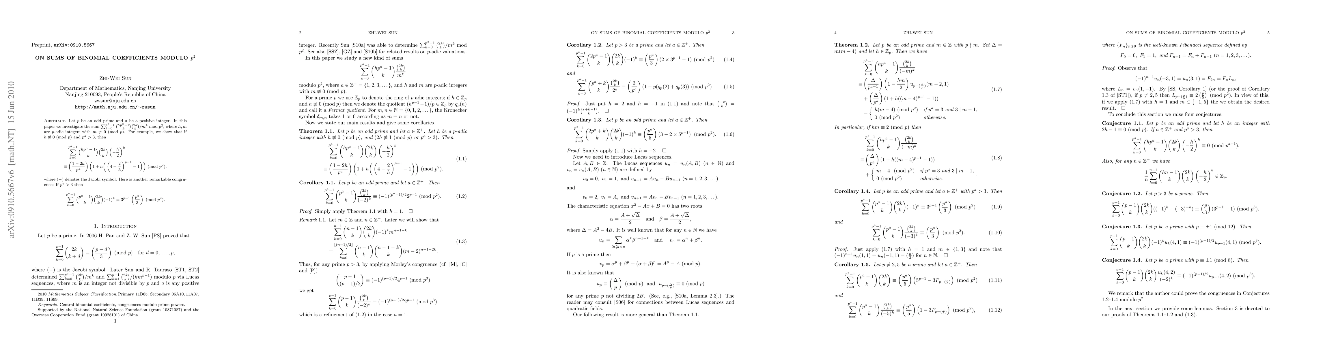 Let p be an odd prime and let a be a positive integer. In this paper we investigate the sum $\sum_{k=0}^{p^a-1}\binom{hp^a-1}{k}\binom{2k}{k}/m^k$ mod p^2, where h,m are p-adic integers with m\not=0 (mod p). For example, we show that if h\not=0 (mod p) and p^a>3 then $$ sum_{k=0}^{p^a-1}\binom{hp^a-1}{k}\binom{2k}{k}(-h/2)^k =(\frac{1-2h}{p^a})(1+h((4h-2)^{p-1}/h^{p-1}-1)) (mod p^2),$$ where (-) denotes the Jacobi symbol. Here is another remarkable congruence: If p>3 then $$\sum_{k=0}^{p^a-1}\binom{p^a-1}{k}\binom{2k}{k}(-1)^k =3^{p-1}(\frac{p^a}3) (mod p^2).$$