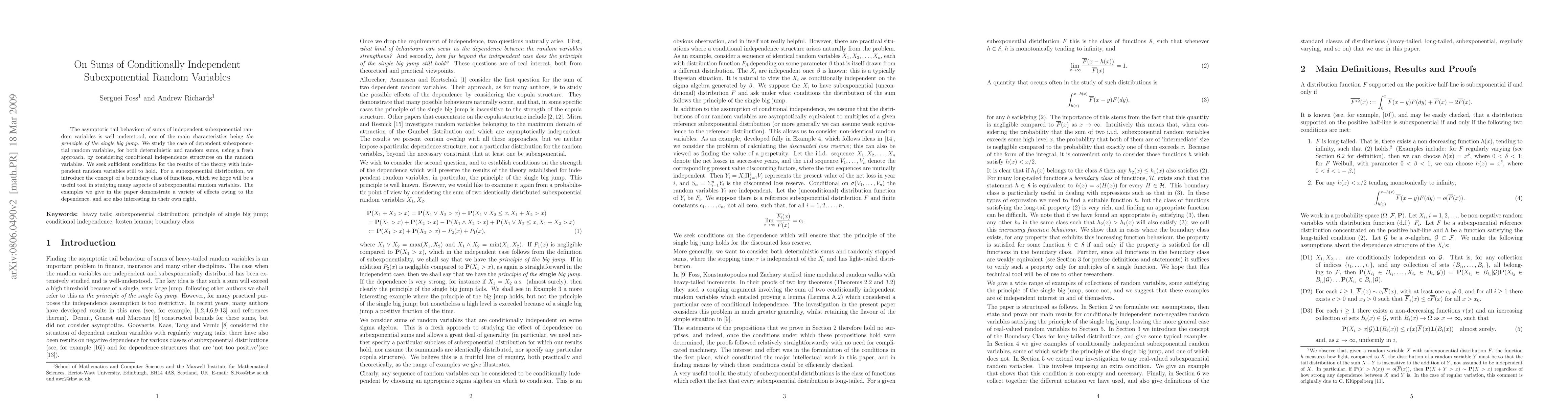 This paper investigates the asymptotic tail behavior of sums involving conditionally independent subexponential random variables, extending the principle of the single big jump to dependent cases. It introduces a boundary class of functions to facilitate analysis and provides sufficient conditions for the theory of independent subexponential variables to apply, showcasing various dependency effects through illustrative examples.