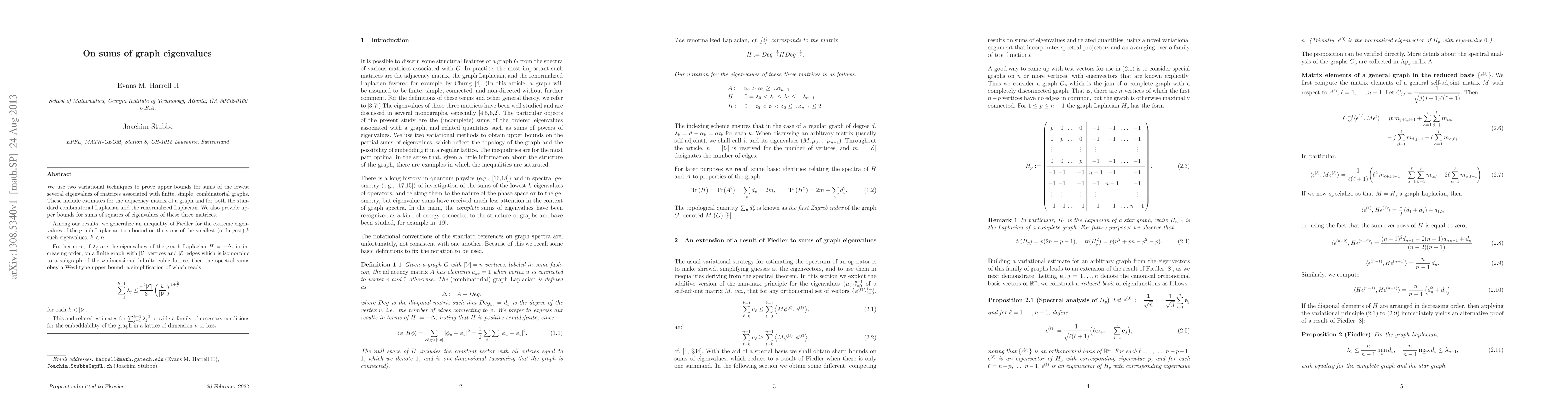 This paper employs variational techniques to establish upper bounds for sums of the smallest several eigenvalues of matrices associated with combinatorial graphs, including adjacency, combinatorial Laplacian, and renormalized Laplacian matrices. It generalizes Fiedler's inequality and provides a Weyl-type upper bound for spectral sums, offering necessary conditions for graph embeddability in lattices.
