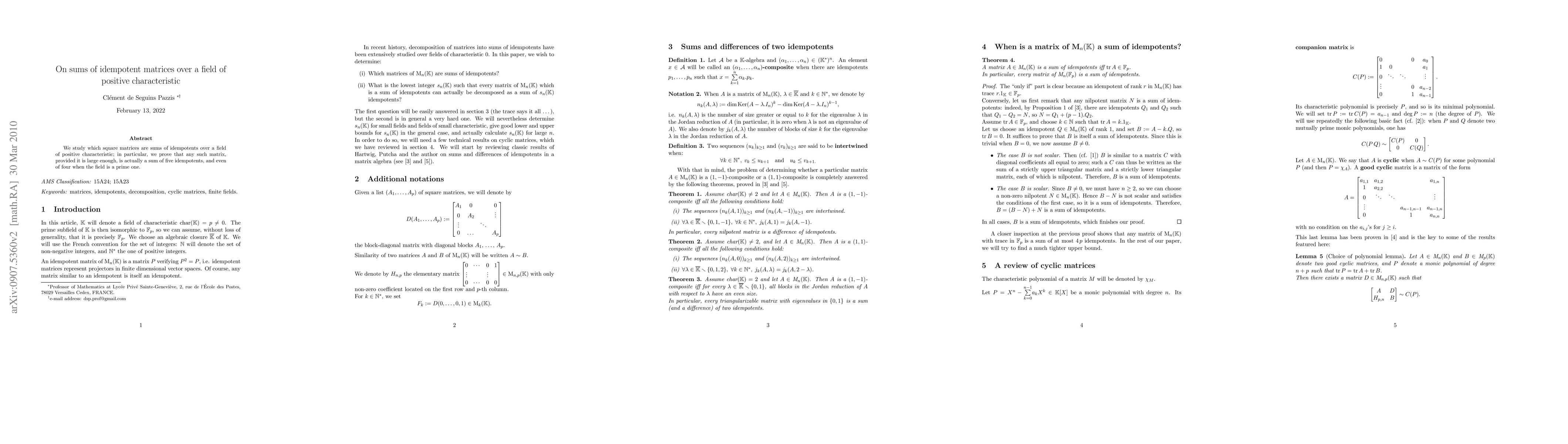 Researchers prove that large enough idempotent matrices over fields of positive characteristic can be expressed as sums of five or four idempotents.